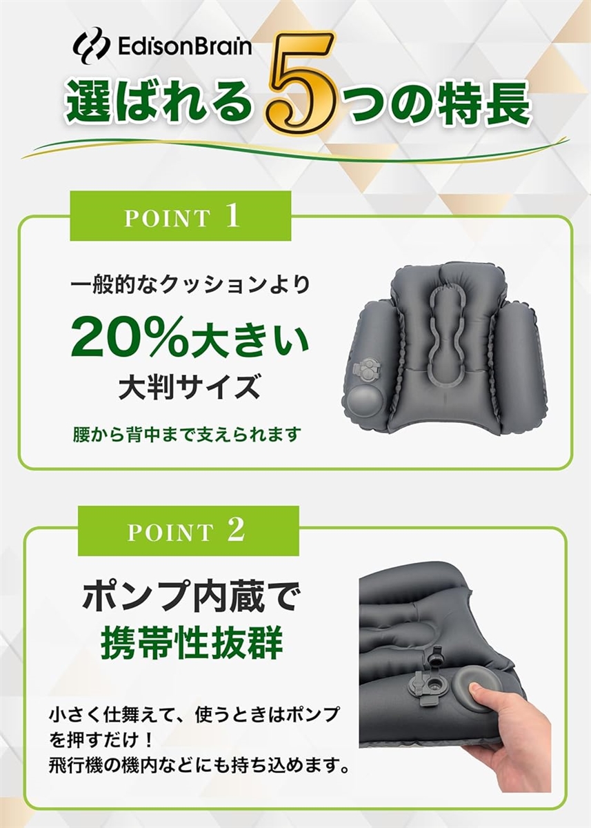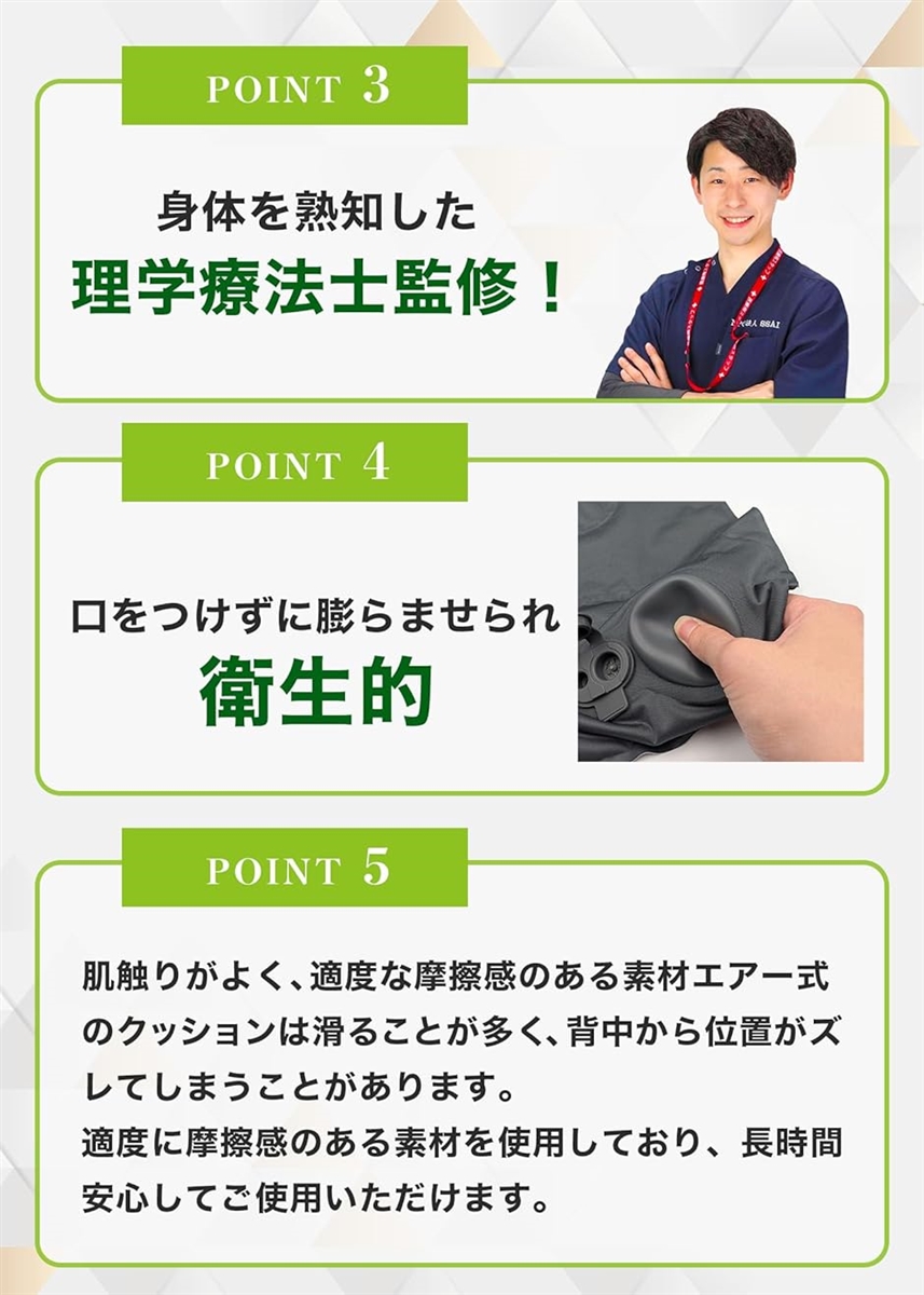 「衛生的」エアータイプのクッションは口で膨らませるタイプが多いため、衛生的ではありません。
