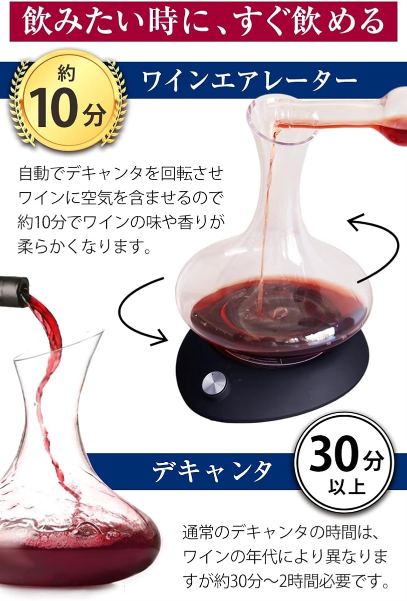 所要時間10分。デキャンタと比べて、短時間でワインの味や香りが柔らかになります。