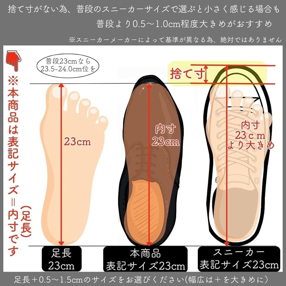 幅広・甲高の方はサイズ大きめを検討ください 大きく感じた場合は中敷きで若干の調整ができます。