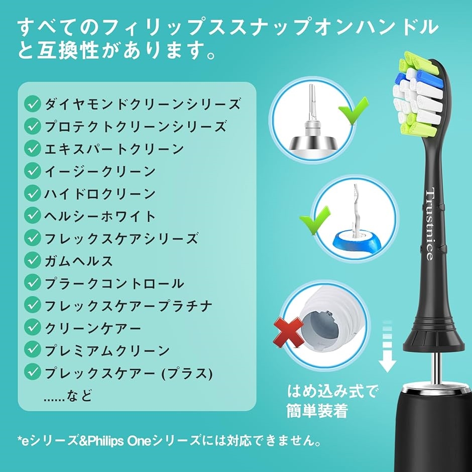 Trustnice 替えブラシはダイヤモンドクリーン、イージークリーン、プレミアムクリーン、エキスパートクリーン、ガムヘルス、エッセンスプラス、フレックスケアー シリーズ、キッズ、ヘルシーホワイト、ヘルシーホワイトプラス、パワーアップ、プロテクトクリーンなど全てのフィリップス ソニッケアー 電動歯ブラシでお使いいただけます。