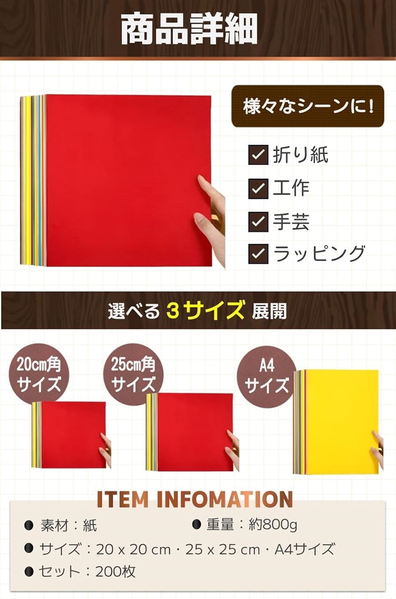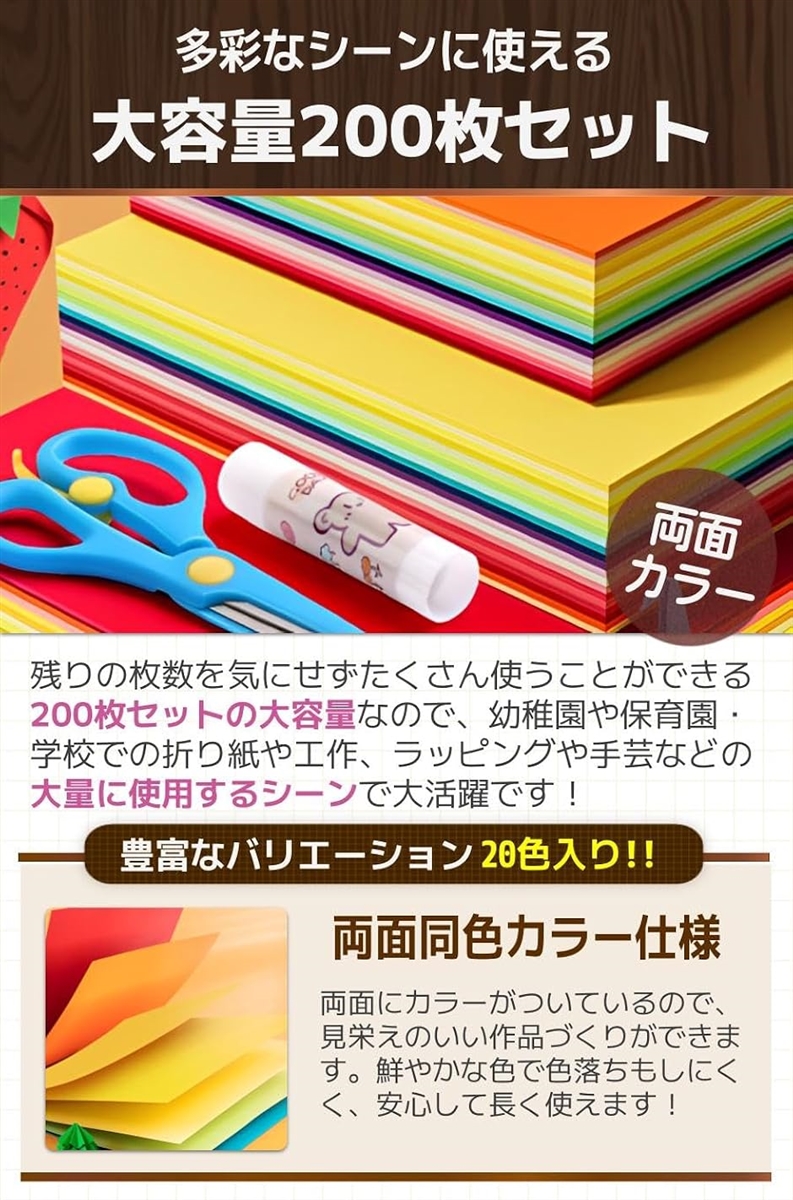 「大容量200枚セット」残りの枚数を気にせずたくさん使うことができる200枚セットの大容量なので、幼稚園や保育園・学校での折り紙や工作、ラッピングや手芸などの大量に使用するシーンで大活躍です。