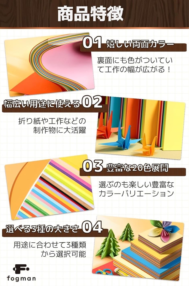 「商品特徴」(1)嬉しい両面カラー:裏面にも色がついていて工作の幅が広がる。/(2)幅広い用途に使える:折り紙や工作などの制作物に大活躍/(3)豊富な20色展開:選ぶのも楽しい豊富なカラーバリエーション/(4)選べる3種の大きさ:用途に合わせて3種類から選択可能