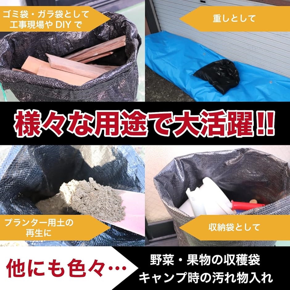 災害対策、長期土塁、その他ガラ袋、重し、土の保管、運搬、汚れ物の収納袋、プランター土の再生等、幅広い用途にお使いいただけます。