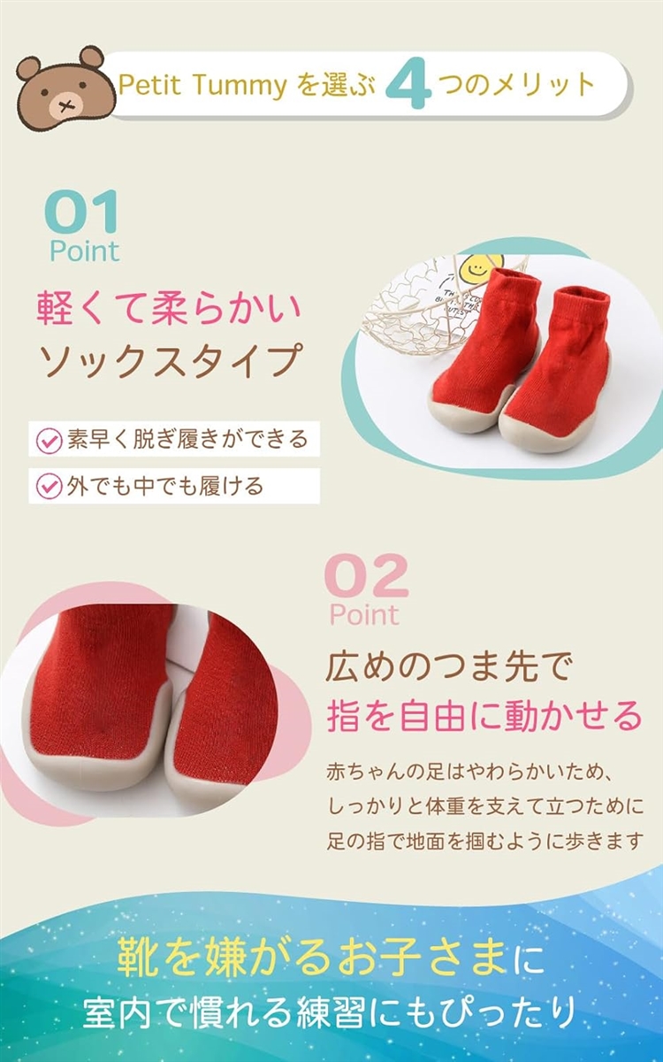 *「 安全性 」軽くて柔らかいからファーストシューズに選ばれる履きやすさ。靴を履くのを嫌がる赤ちゃんでも履きやすいソックスシューズです。
