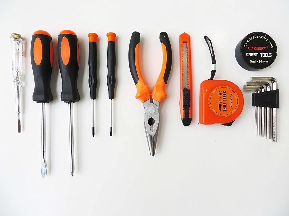 ・2メートル巻尺、六角レンチ、カッター、電圧テスター、電気テープ、プラスドライバー、マイナスドライバー、精密ドライバー、ラジオペンチなど15点セットです。