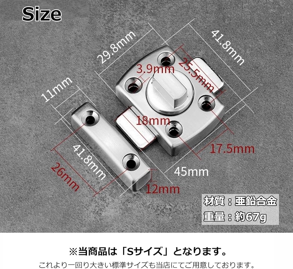 鍵穴がなく、回転式で施錠できる取り付け簡単な内鍵用ドアロック2個セット(Sサイズ)です。