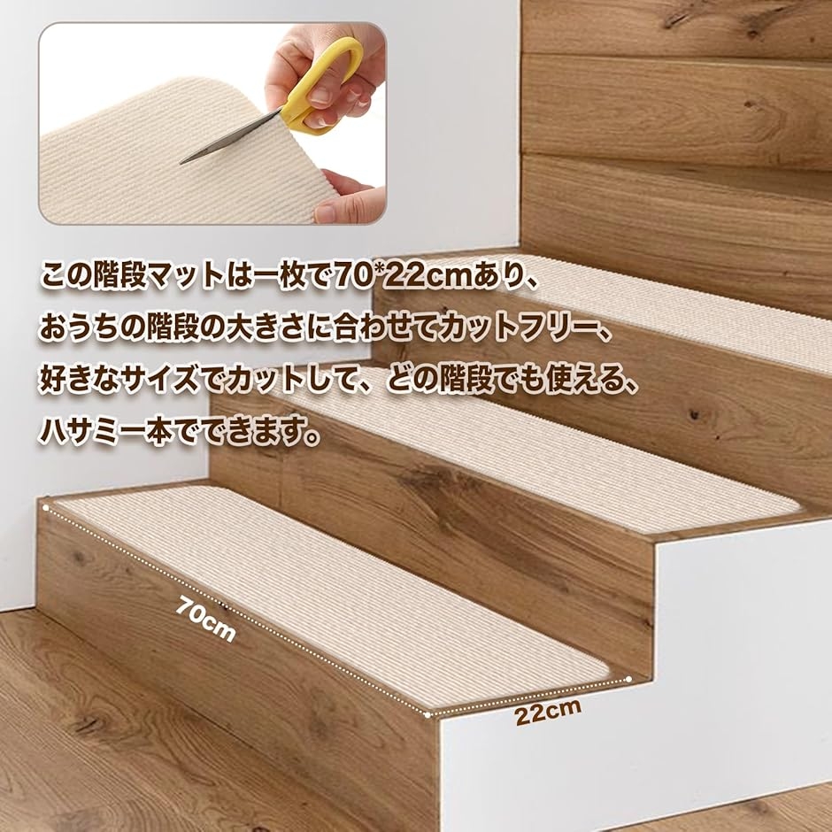 「カットオッケー、どこでも使える」この階段マットは一枚で70x22cmあり、おうちの階段の大きさに合わせてカットフリー、好きなサイズでカットして、どの階段でも使える、ハサミ一本でできます。