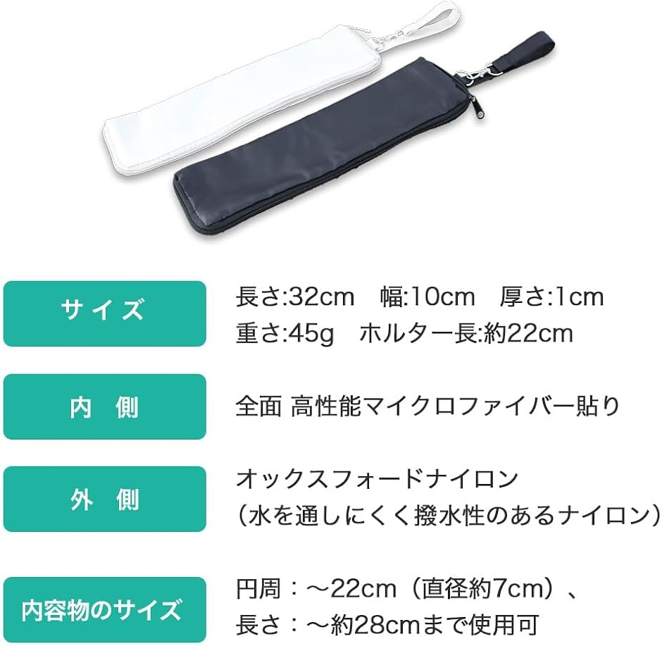 サイズ(長さ:32cm 幅:10cm 厚さ:1cm 重さ:45g ホルター長:約22cm)、内側(全面高性能マイクロファイバー貼り)、外側(オックスフォードナイロン*水を通しにくく撥水性のあるナイロン)