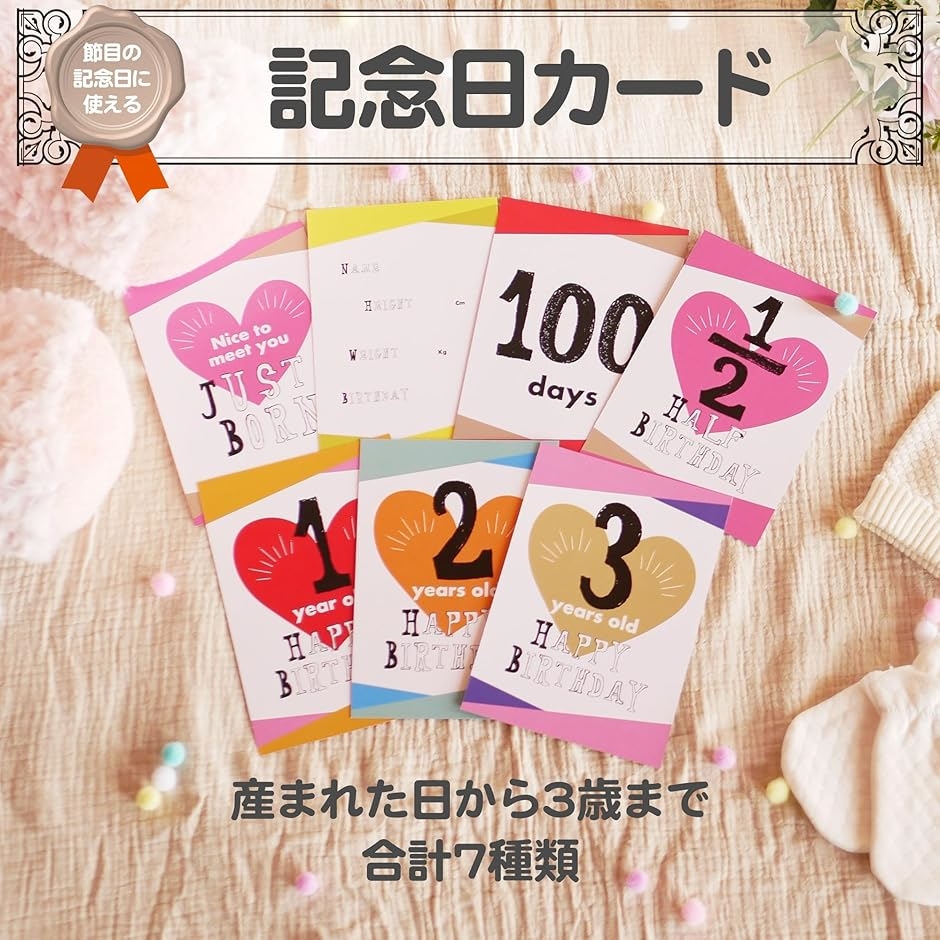 記念日カードは、「JUST BORN」「名前・誕生日・身長・体重」「HALF BIRTHDAY」「100DAYS」「1st Birthday」「2nd Birthday」「3rd Birthday」の7種類。