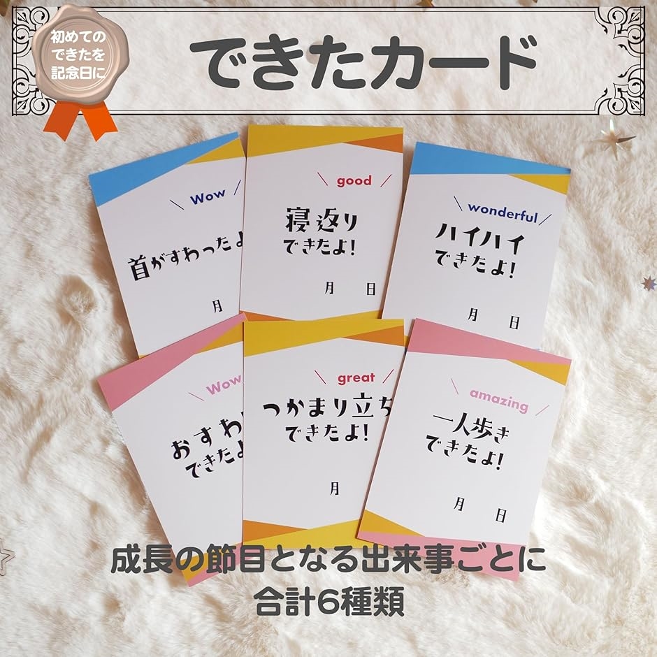 「首がすわった」「寝返り」「おすわり」「ハイハイ」「つかまり立ち」「ひとり歩き」、「できた」カードには日付を入れる欄があるので、後で写真を見た時にいつの出来事かすぐにわかります。