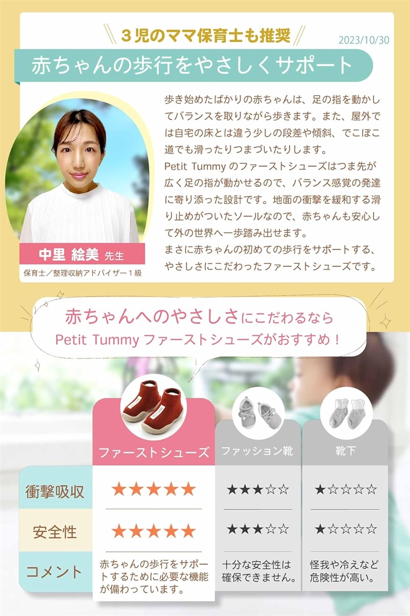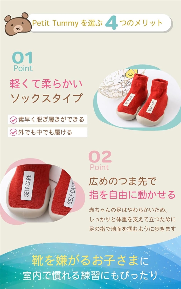 ・「 安全性 」軽くて柔らかいからファーストシューズに選ばれる履きやすさ。靴を履くのを嫌がる赤ちゃんでも履きやすいソックスシューズです。
