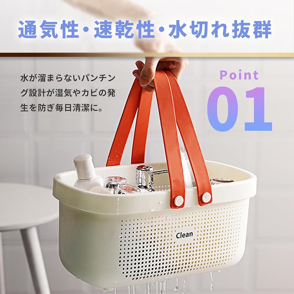 バスケットを持ち上げると自然に水が排出されるので入浴のさいには気軽に持ち込むことができ使い勝手抜群。