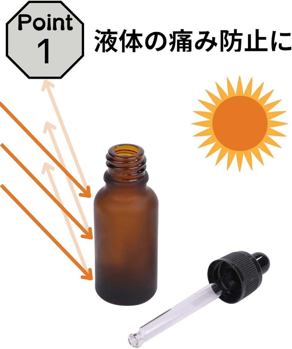 「ガラス製の遮光瓶で液体の痛み防止に」熱や紫外線から守るので中身の液体の傷みを防止します。