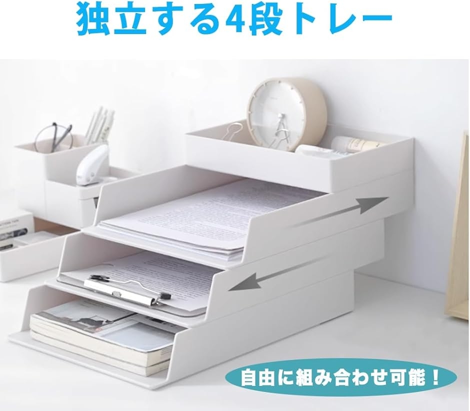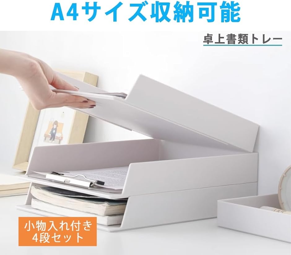縦長のA4トレーが3段、A5サイズの小物入れが1段、合計4段の卓上トレーとなっておりたくさんの書類を収納可能となります。