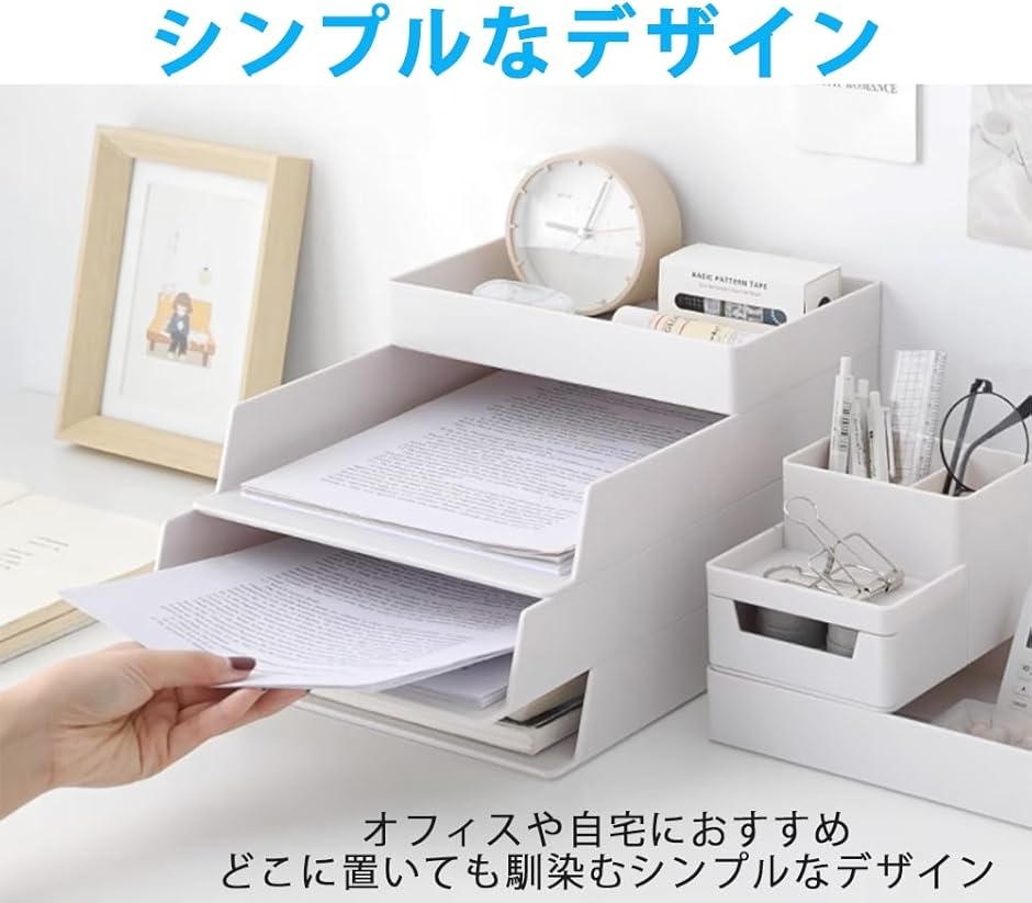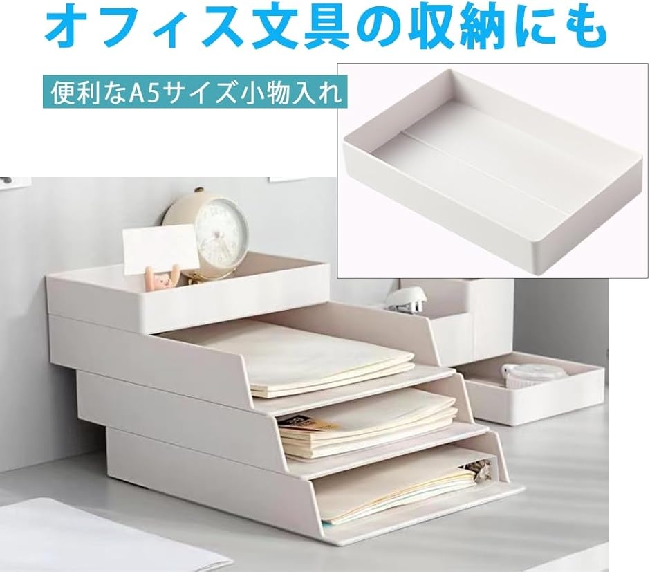 「小物入れ付属でオフィス文具の収納も」4つのトレーの中の1つがA5サイズの小物入れとなっており付箋やボールペン、セロハンテープなど文房具も収納できます。