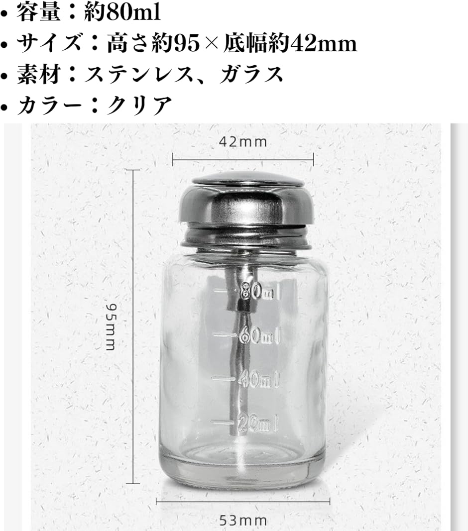 | 商品名 | プッシュダウンポンプディスペンサー 液体保存容器 プレスボトル 押し下げ ポンプボトル ネイルポリッシュリムーバー メイク落とし 80ml |