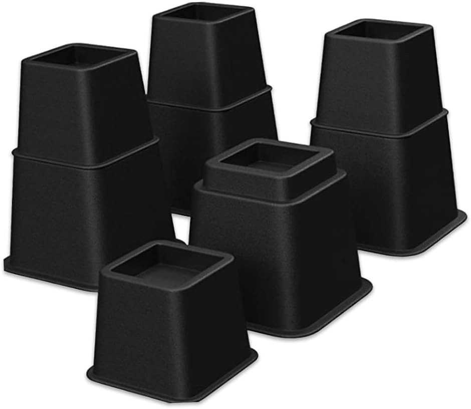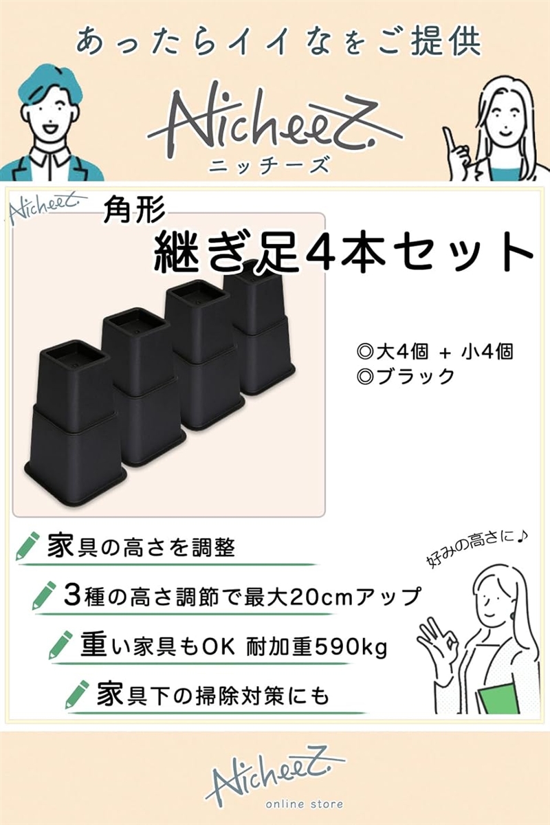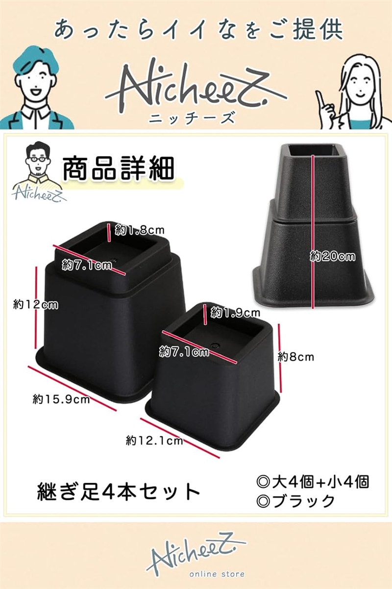 「商品内容」テーブル継ぎ脚セット(大4個+小4個) カラー:ブラック サイズ:(大)高さ/約12cm 下底/約15.9cmx15.9cm 上底/約7.1cmx7.1cm (小)高さ/約8cm 下底/約12.1cmx12.1cm 上底/約7.1cmx7.1cm 結合時の高さ/約20cm