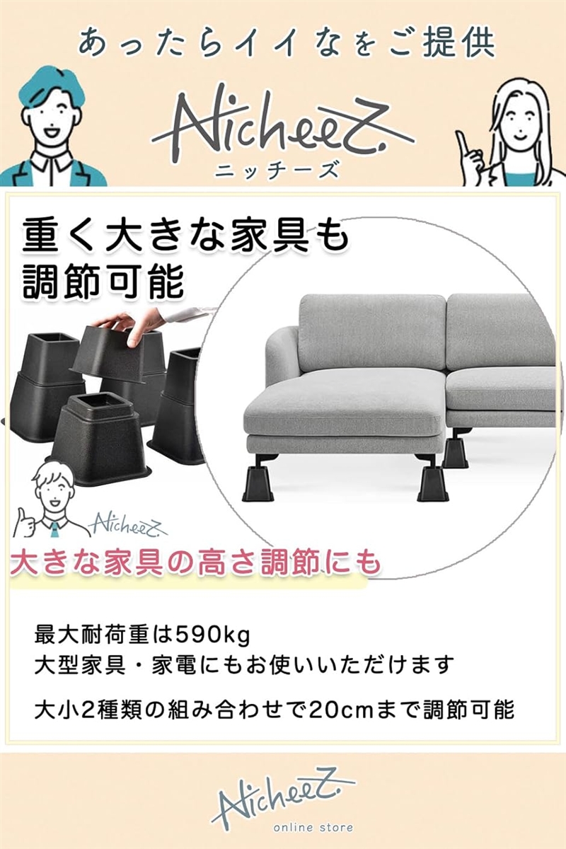 「重く大きな家具も調節可能」最大耐荷重は590kgなのでソファやTVボード・洗濯機などの大型家具・家電にもお使いいただけます。