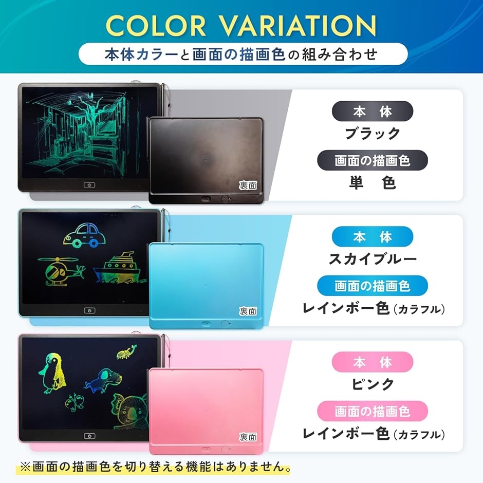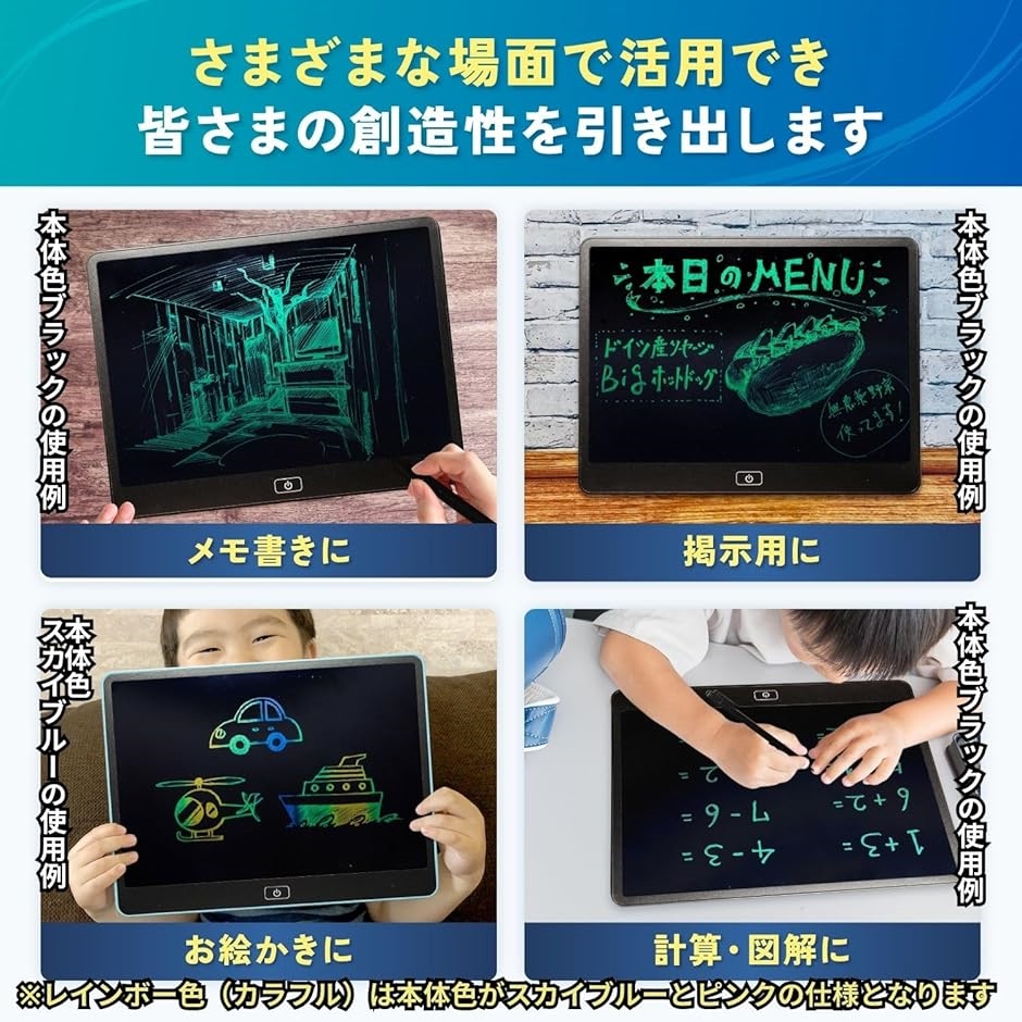 「さまざまな用途で活用可能」メモ書きやお絵描きボードとしての活用のほか、計算や図解、漢字や英単語学習、掲示用ツール、デッサン、筆談ボード、伝言メモなどさまざまな用途での活用が可能であり、薄くて軽いデザインは直感的に使いやすく贈り物にも最適です。