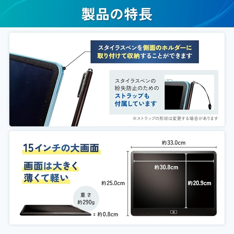 | 商品名 | 15インチ電子メモパッド 描画色 単色 ストラップ付 お絵描きボード 電池式 ブラック |