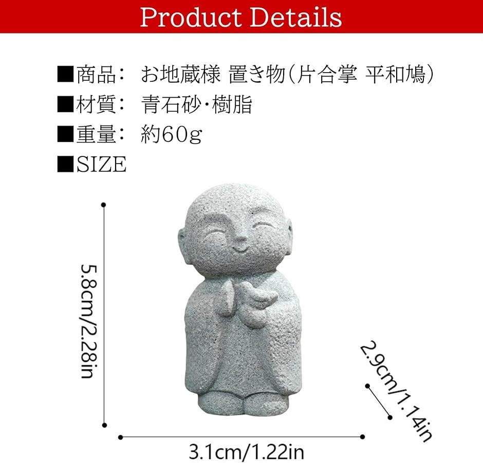 | 商品名 | お地蔵さん 置物 ミニ 可愛い 御影石 お地蔵様 癒し 仏像 石 守り神 オブジェ H5.8cm 片合掌 平和鳩 |