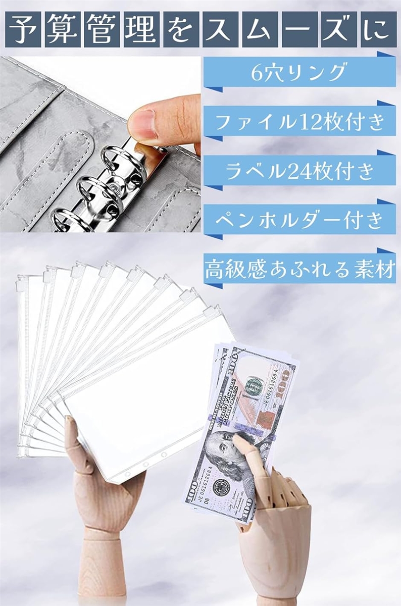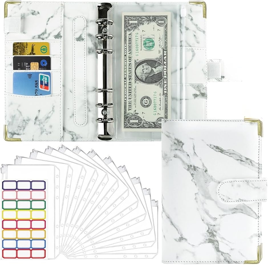 | 商品名 | 家計管理 ポーチ 家計簿 予算バインダー ファイル ポケット12個付き お金管理 予算管理 大理石 A6 ホワイト |