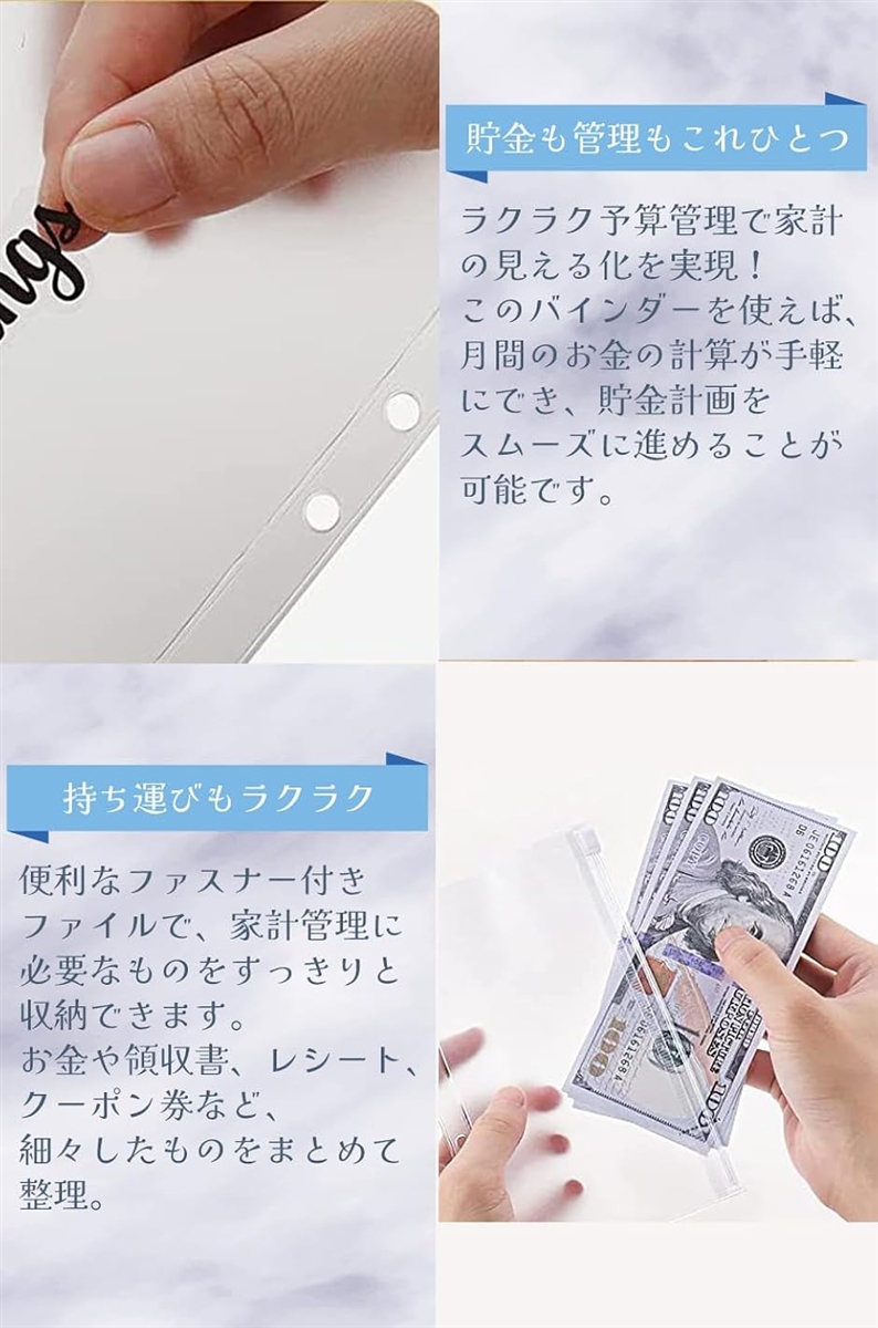 「大容量予算バインダー」手帳カバー(6穴リングルーズリーフバインダー)、ファスナー付きPVC素材のファイル12枚、ラベル24枚が含まれる。