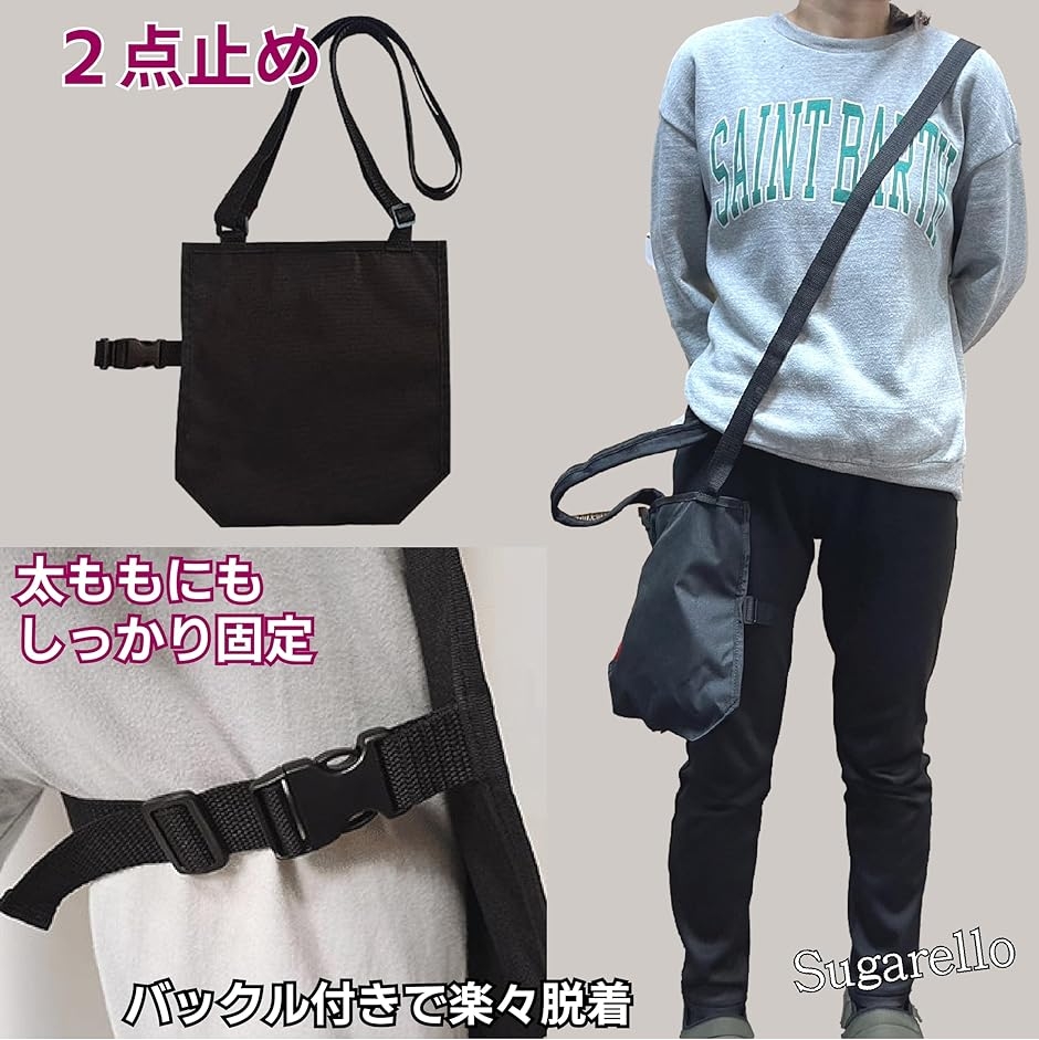 肩掛け用ストラップと太もも用レッグストラップのダブル構造で、歩行時にもしっかりと固定できます。