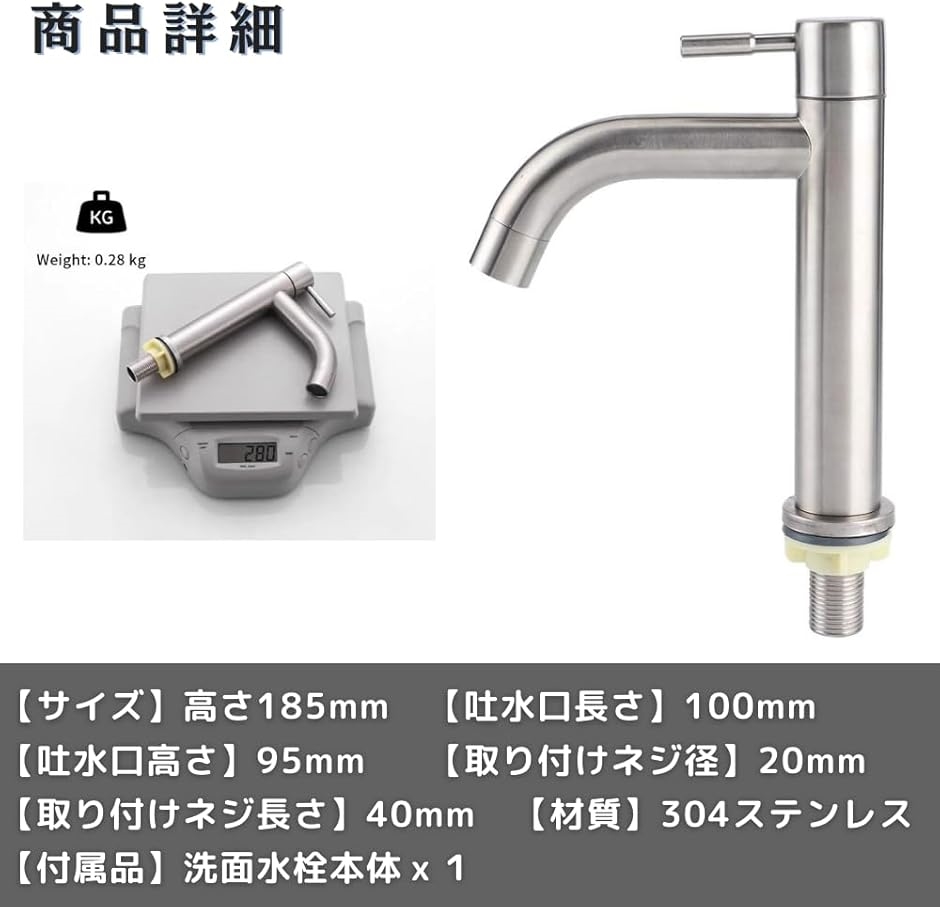 サイズ:高さ185mm、吐水口長さ100mm、吐水口高さ95mm、取り付けネジ径20mm(1/2)、取り付けネジ長さ40mm