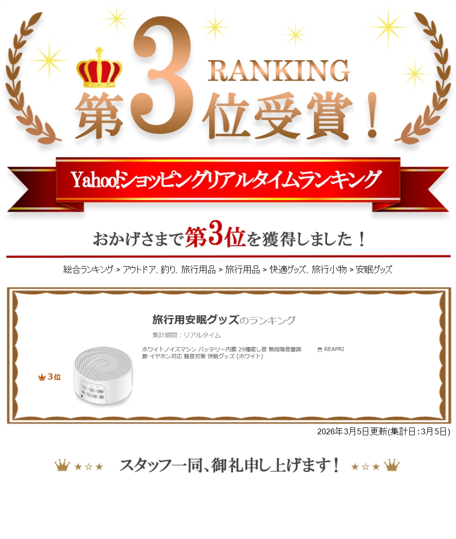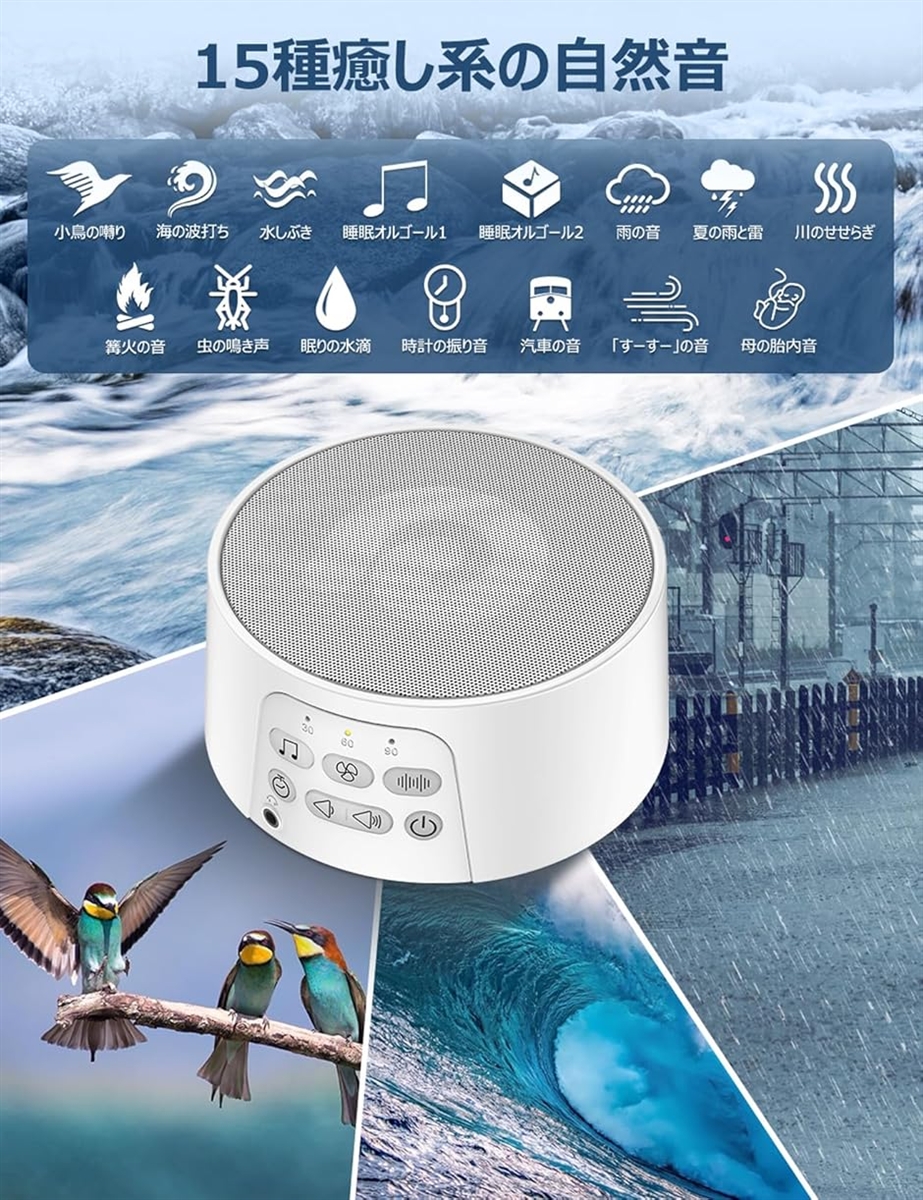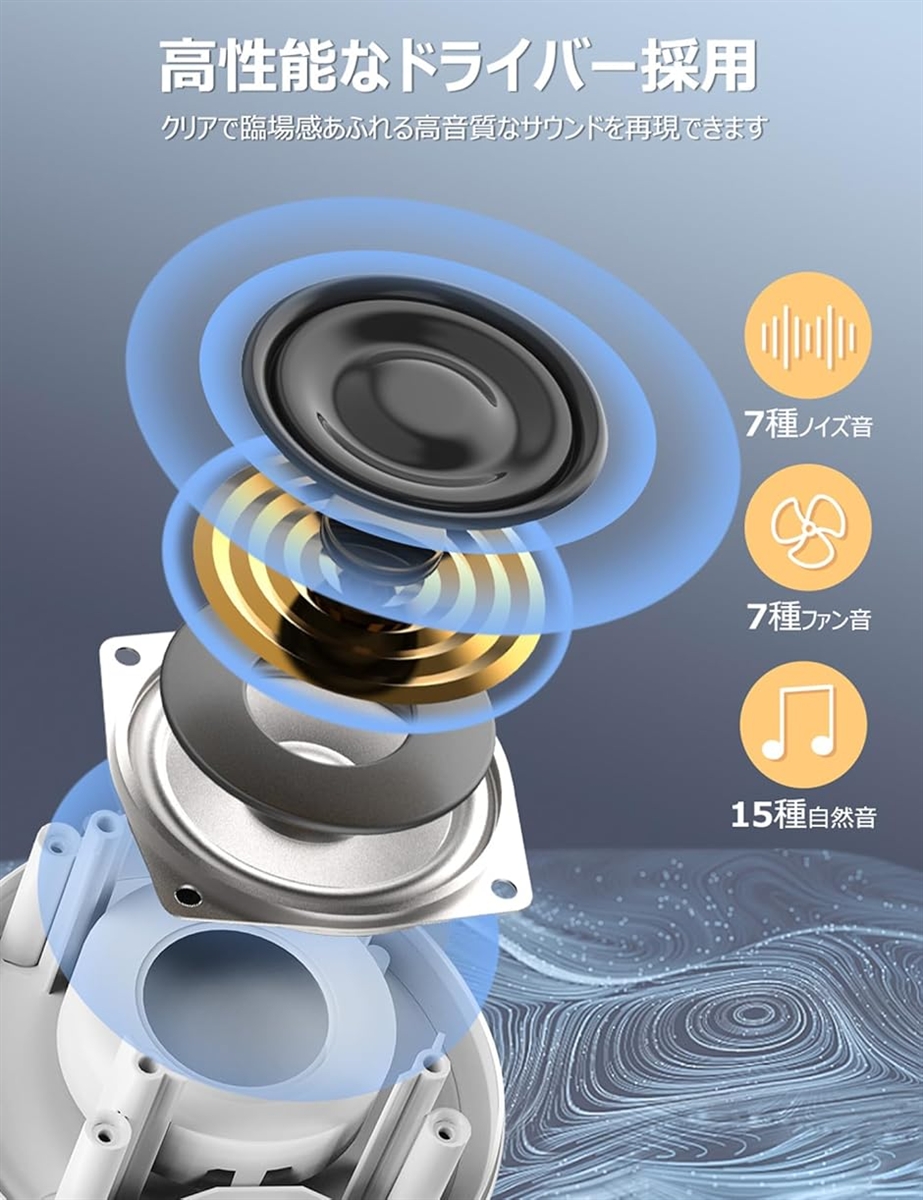 | 商品名 | ホワイトノイズマシン バッテリー内蔵 29種癒し音 無段階音量調節 イヤホン対応 騒音対策 快眠グッズ ホワイト |