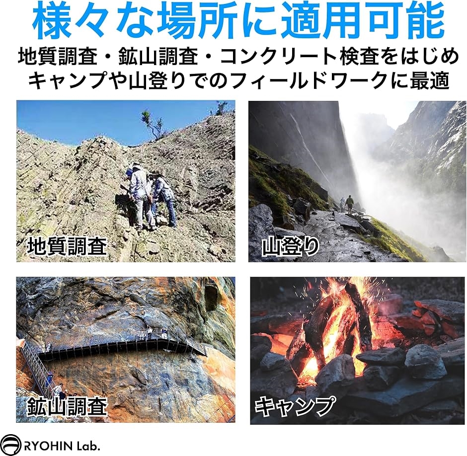 「様々な場所に適用可能 」地質調査・鉱山調査・コンクリート検査をはじめ、キャンプや山登りでのフィールドワークのツールにおススメです。