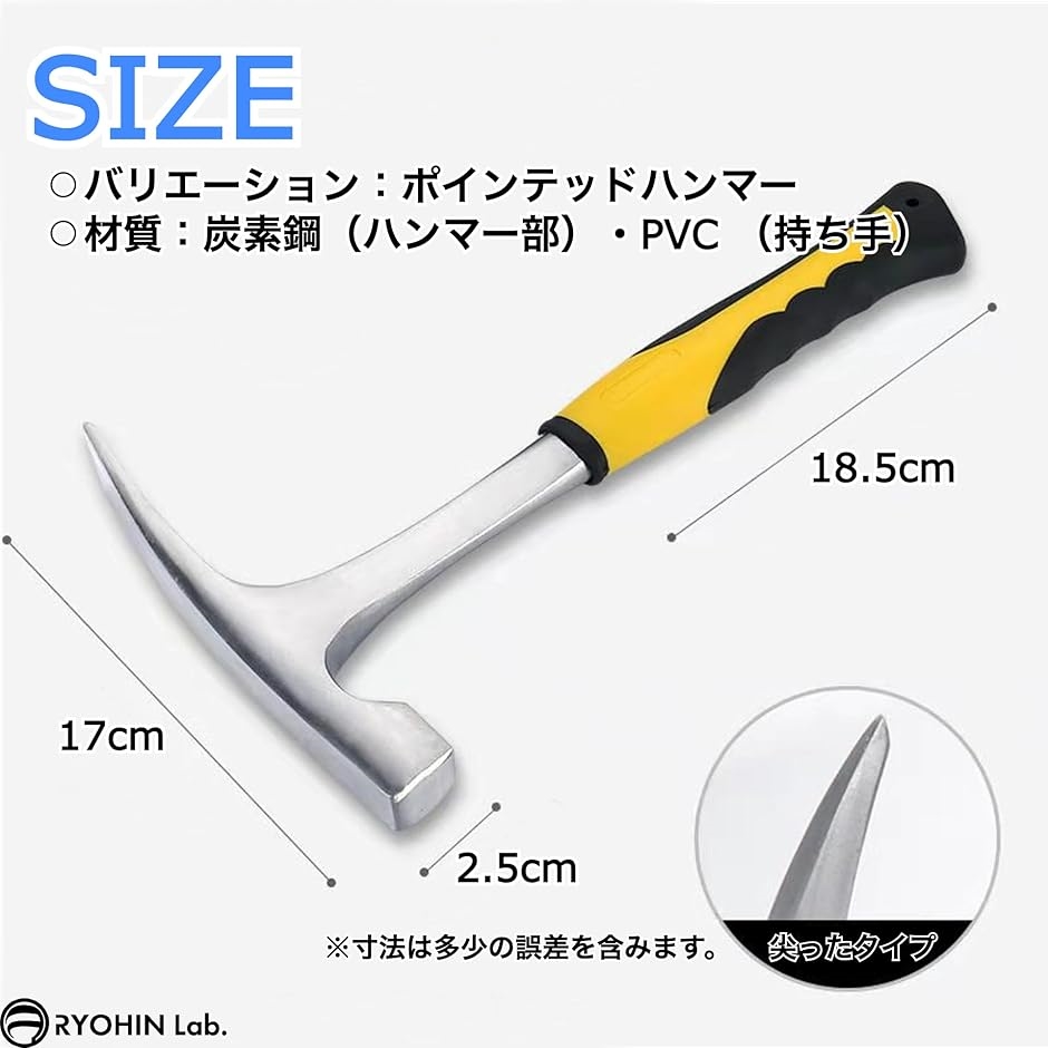 「セット内容」ハンマーx1点、サイズ(約):長さ29cm、幅:17cm、厚さ2cm、重さ(約):900g(ポインテッドハンマー)・800g(フラットハンマー)