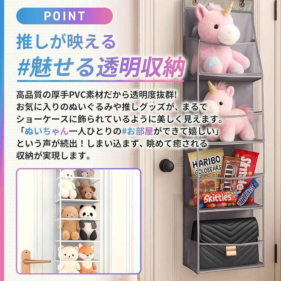 絶妙な透明収納で隠さない美しさ - 厚さ5mmの縦開きポケットでお気に入りをすぐ取り出せ、高品質の厚手PVC素材だから透明度抜群でぬいぐるみや推しグッズをショーケースのように美しく見せます