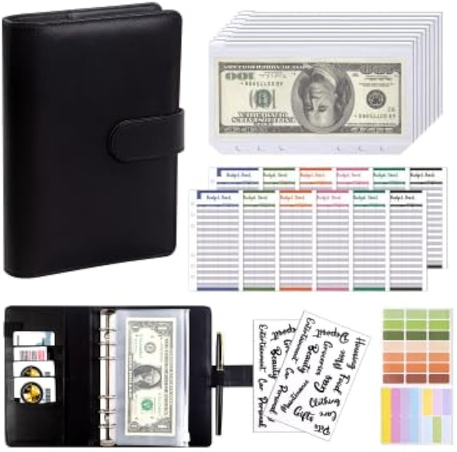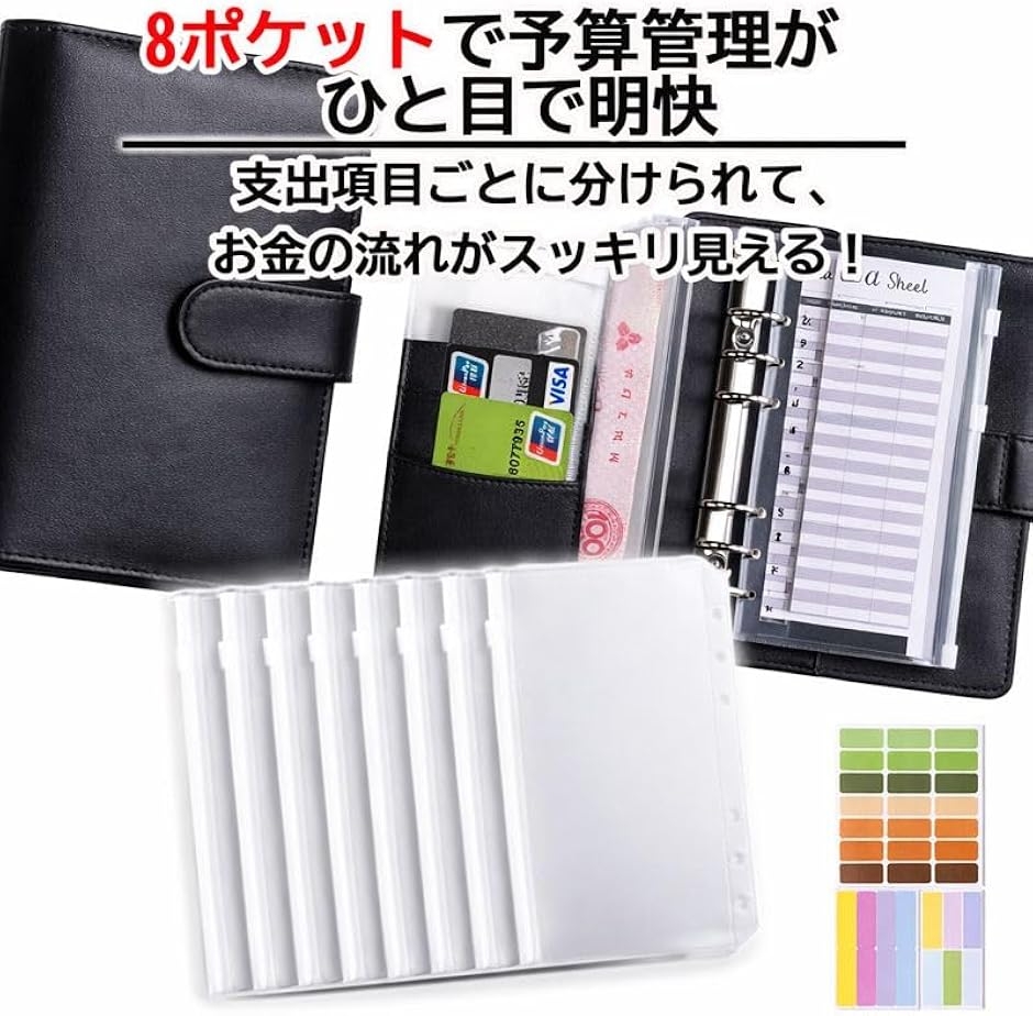 | 商品名 | お金管理ポーチ A6サイズ 家計簿セット 袋分け 貯金ノート 現金管理 ファスナーポケット8枚付き ブラック |