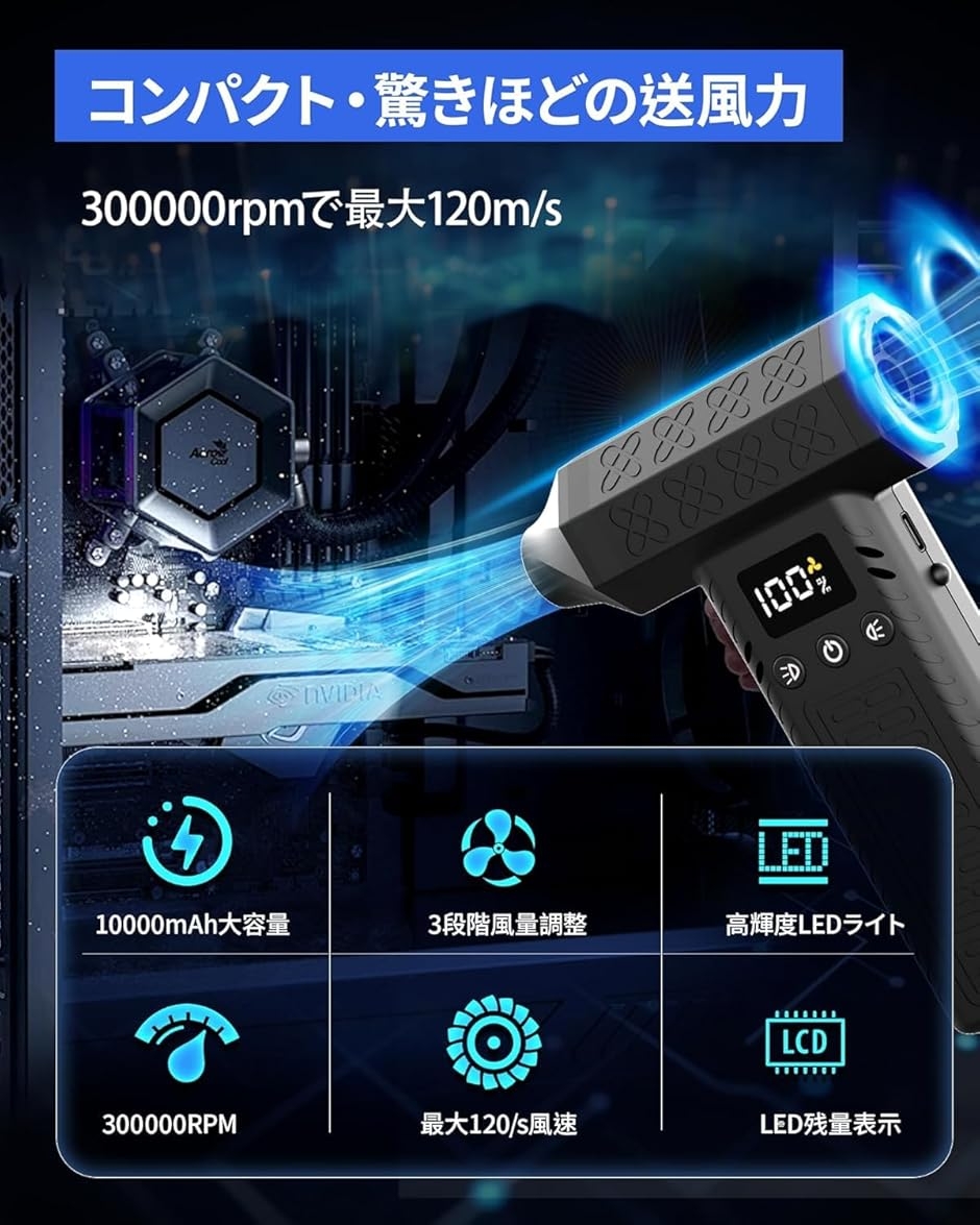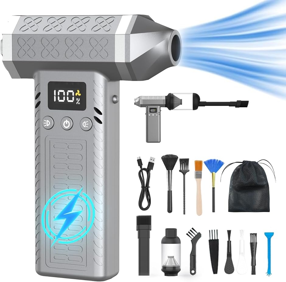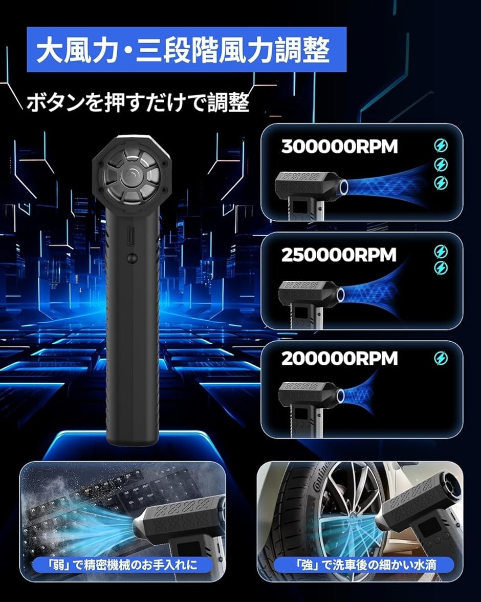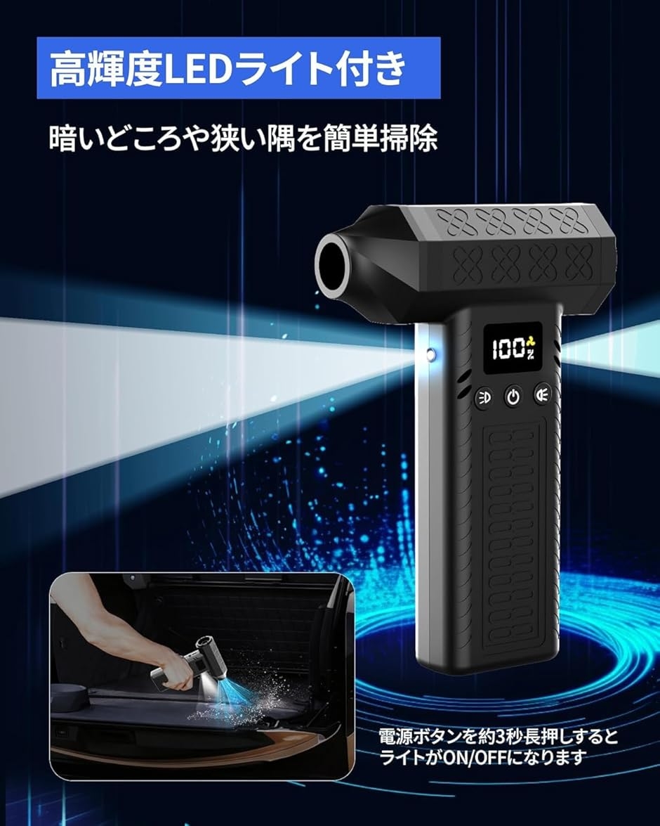 | 商品名 | 1台2役 300000rpm 電動エアダスター 15000pa ミニ掃除機 3段風量調整 超強力 最大風速120m/s 小型 洗車ブロワー ハンディ掃除機 2個LEDライト付き LCDディスプレイ搭載 急速充電式 10000mAh 連続150分使用可能 超軽量 |
