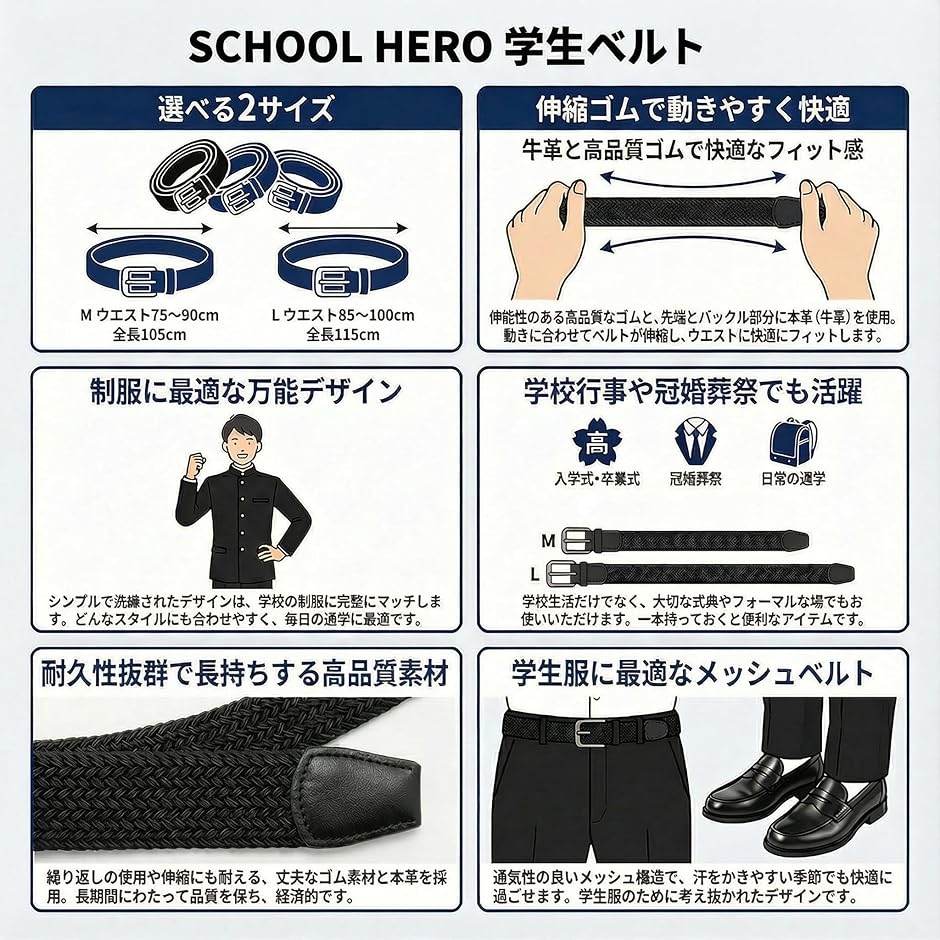 | 商品名 | 学生ベルト 黒 高校生 中学生 大学生 サラリーマン 《ストレッチ素材でストレスフリー》男子 スクールベルト《伸縮ゴムでフィット》メッシュベルト ゴムベルト |