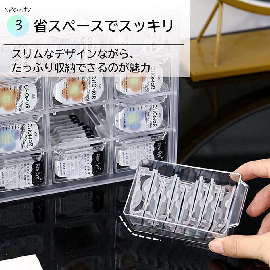 コンタクトレンズはもちろん、アクセサリーやコスメ、文房具などの小物もしっかり整理でき、引き出しごとに分けて管理できるので、取り出しやすく使い勝手も抜群です。
