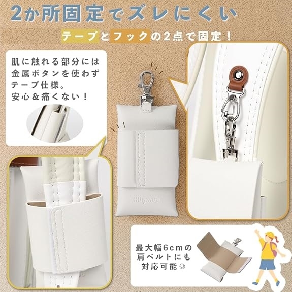 「製品仕様」全長(フック込み):約15cm、縦(フックなし):約11cm、横:約6cm、幅:約2.5cm、裏面固定ベルト全長:約16cm *最大幅6cmの肩ベルトにも対応可能 *手作業で縫製している為、若干の誤差やズレがございます。