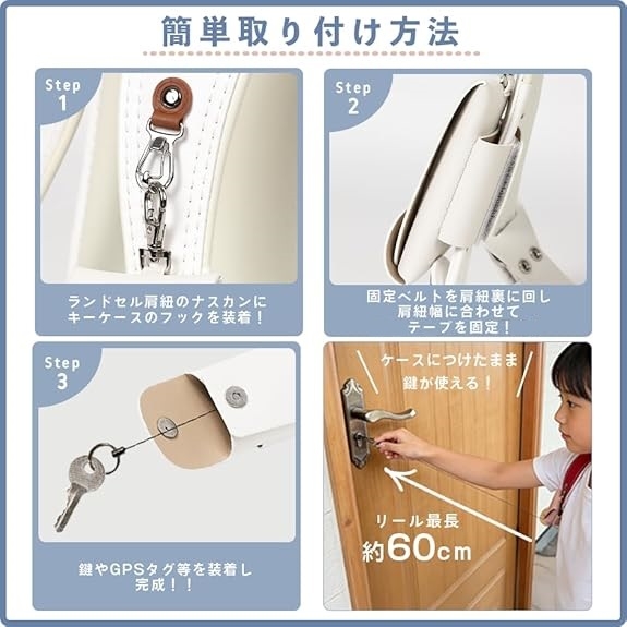 「取り付け方法」(1)ランドセル肩紐のナスカンにキーケースのフックを装着 (2)固定ベルトを肩紐裏に回し、肩紐幅に合わせてテープ固定 (3)鍵やGPSタグ等を装着し完成。