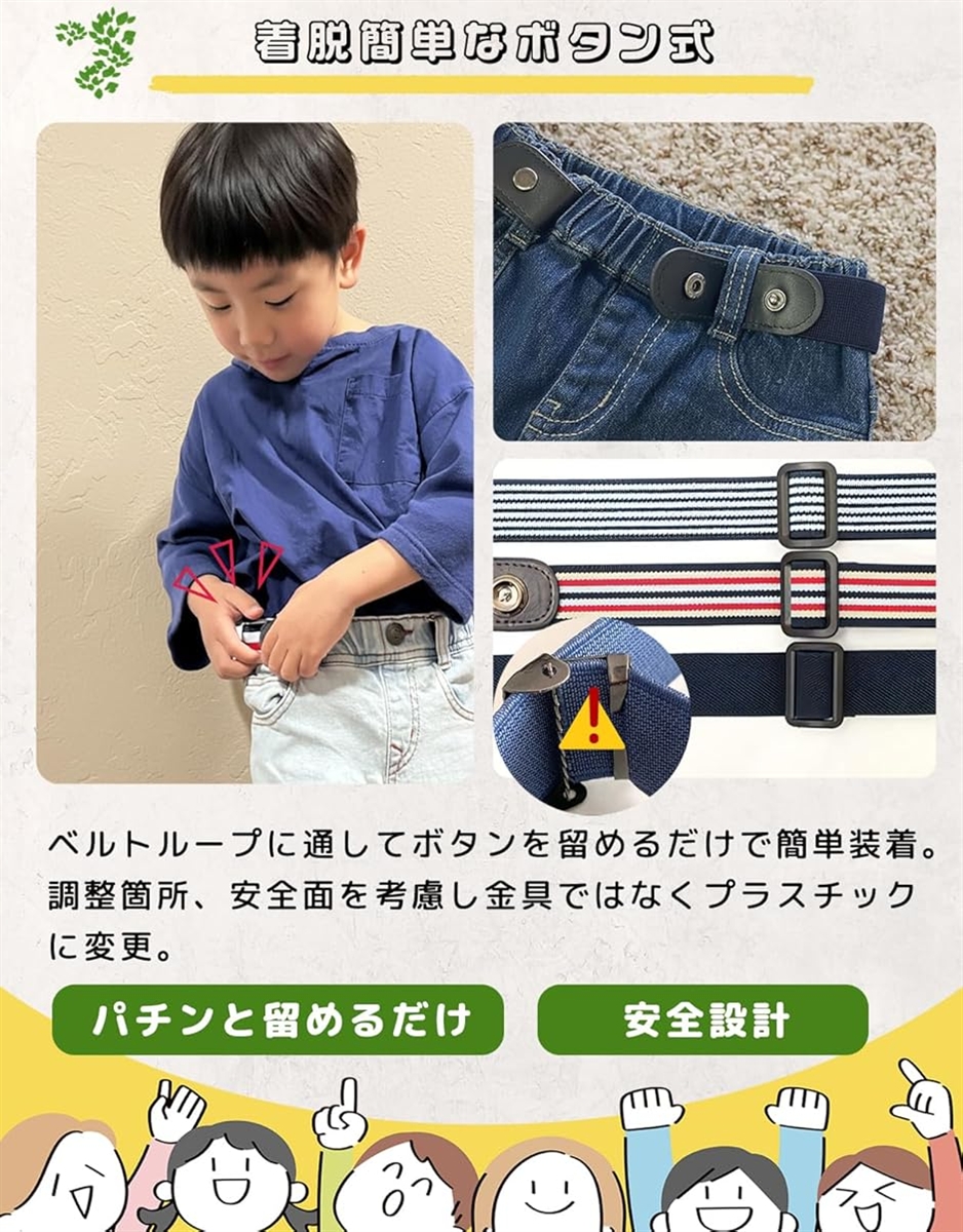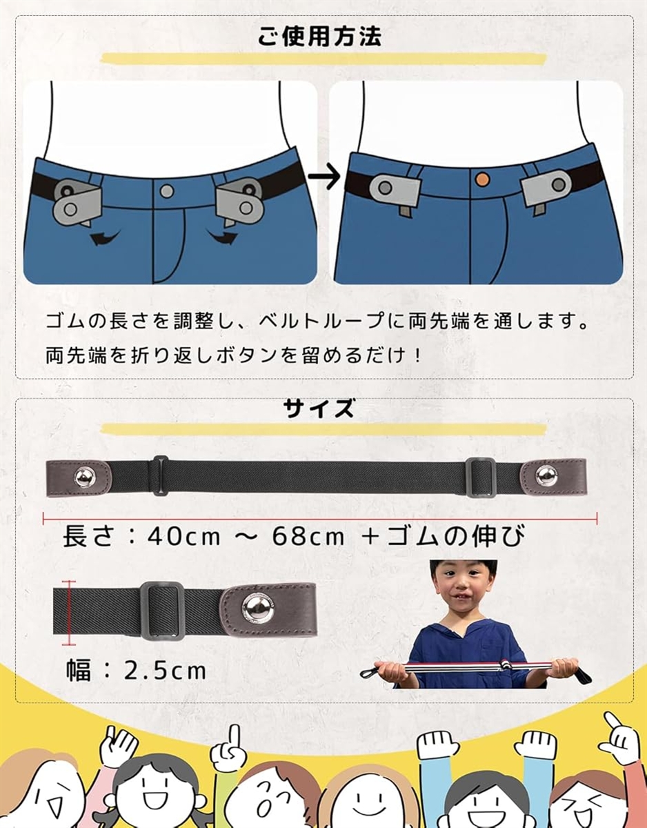 | 商品名 | キッズベルト 子供 ゴム ベルト トイレ簡単・着脱ラク バックルなし 無段階調整 ボタン式 子供用ベルト 入園 入学 幼稚園 小学生 |