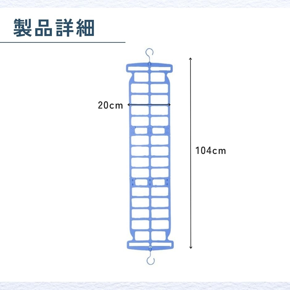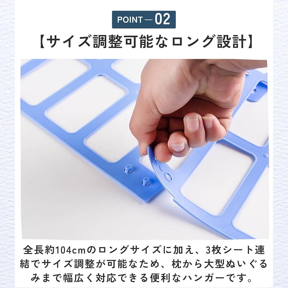 「サイズ調整可能なロング設計」全長約104cmのロングサイズに加え、3枚シート連結でサイズ調整が可能なため、枕から大型ぬいぐるみまで幅広く対応できる便利なハンガーです。