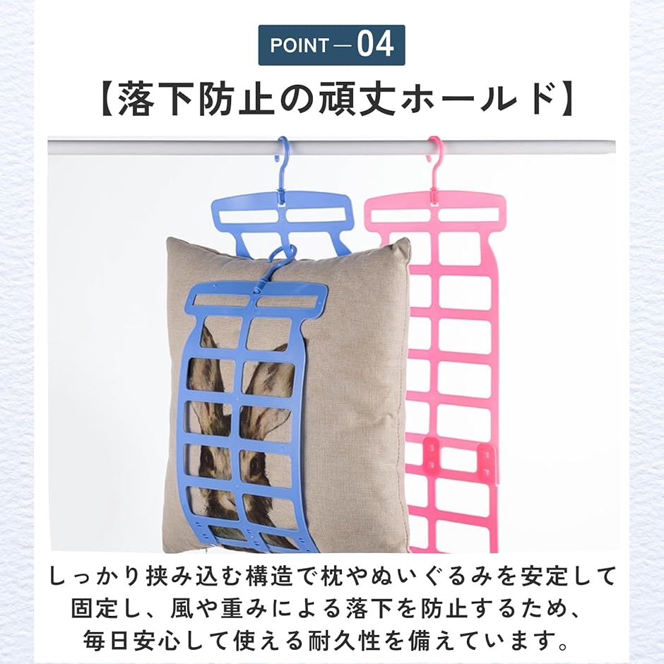 「落下防止の頑丈ホールド」しっかり挟み込む構造で枕やぬいぐるみを安定して固定し、風や重みによる落下を防止するため、毎日安心して使える耐久性を備えています。