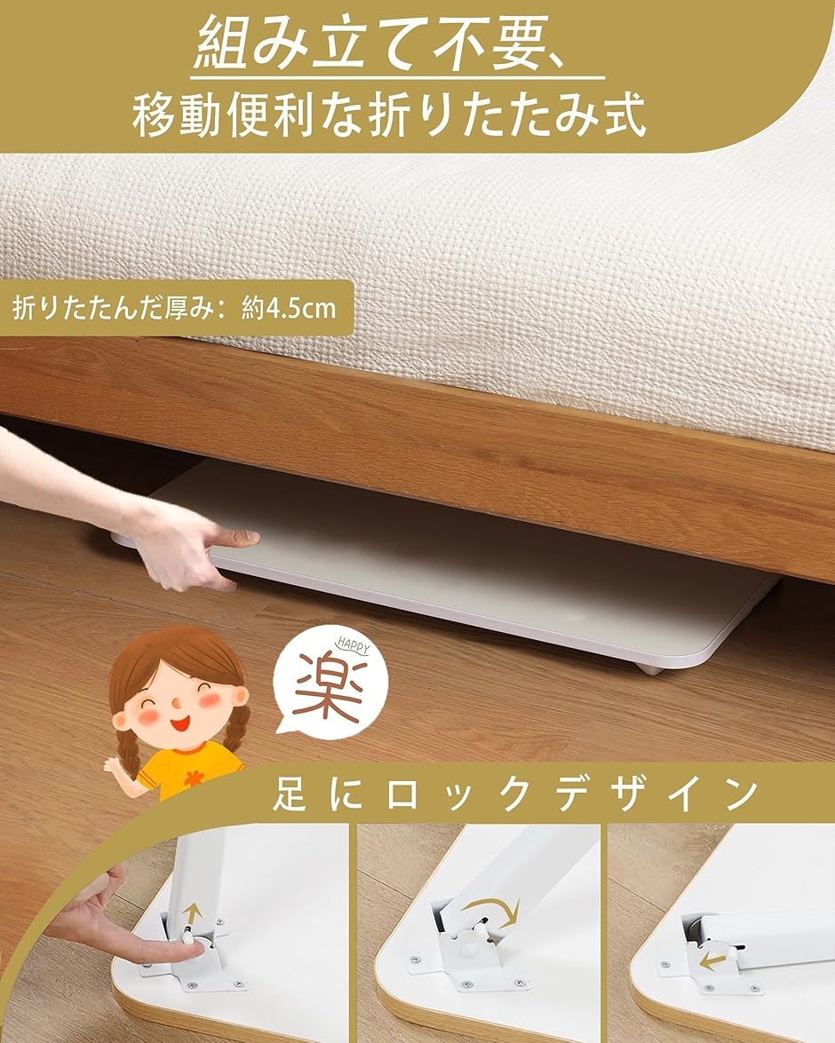 「簡単折り畳みで省スペース」 折りたたみテーブルの魅力、簡単収納。脚を折りたたむだけで、ベッド下やクローゼットの隙間など、限られたスペースにスッキリ収納可能(厚さ約4.5cm)。
