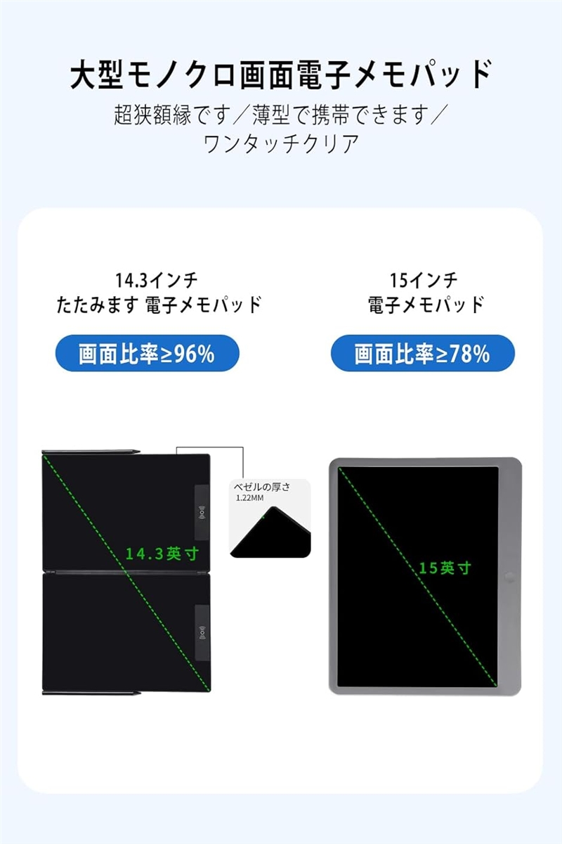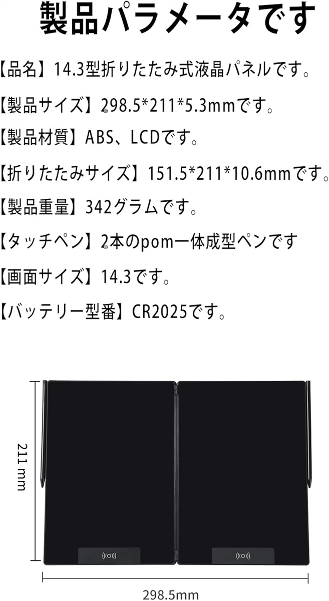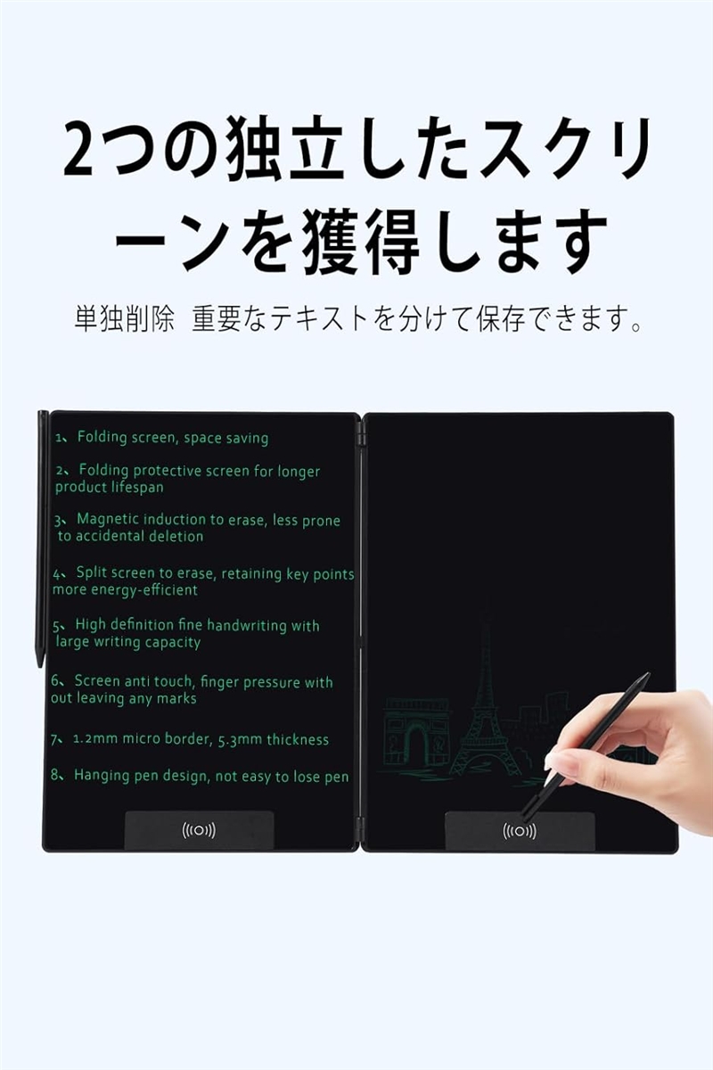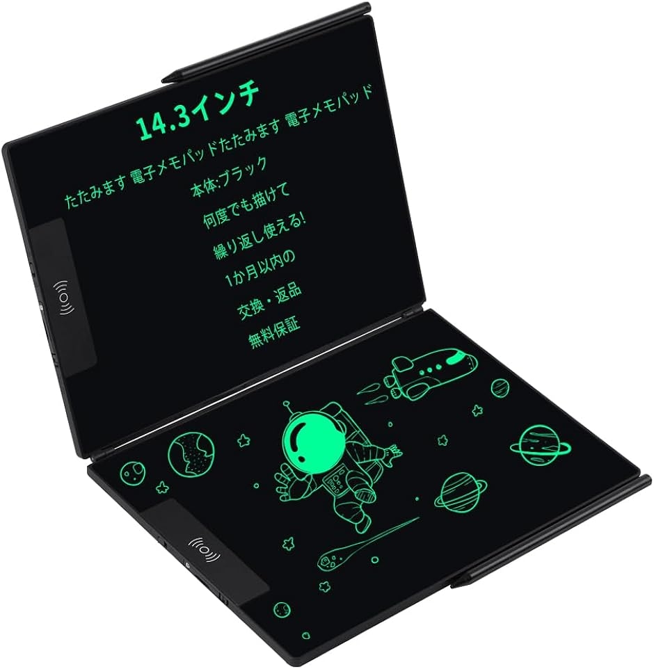 | 商品名 | 電子メモパッド 14.3インチ LCD電子メモパッド 両面折りたたみ式 0.5mm極細線幅 ロック機能付き 書いて消せるボード ワンタッチ消去 スロット式ペン収納 |