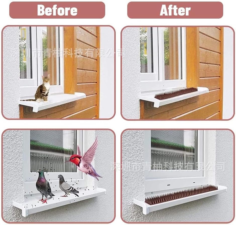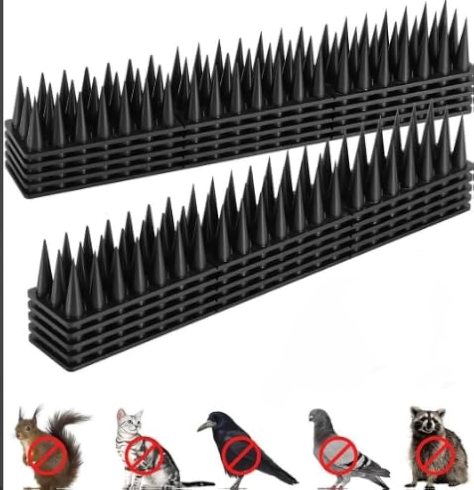 43cmの棘列がラックーンやカラスを遠ざけ、3.5cm高で安全に威嚇、両面テープやタイで簡単設置。