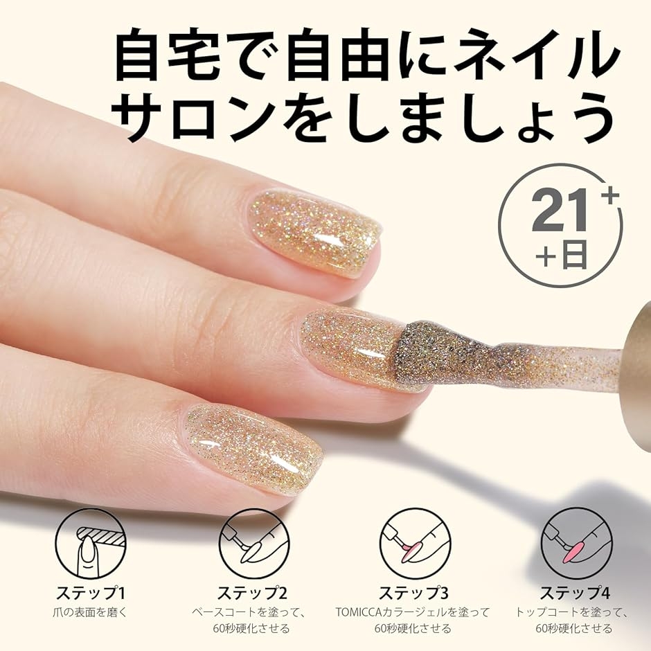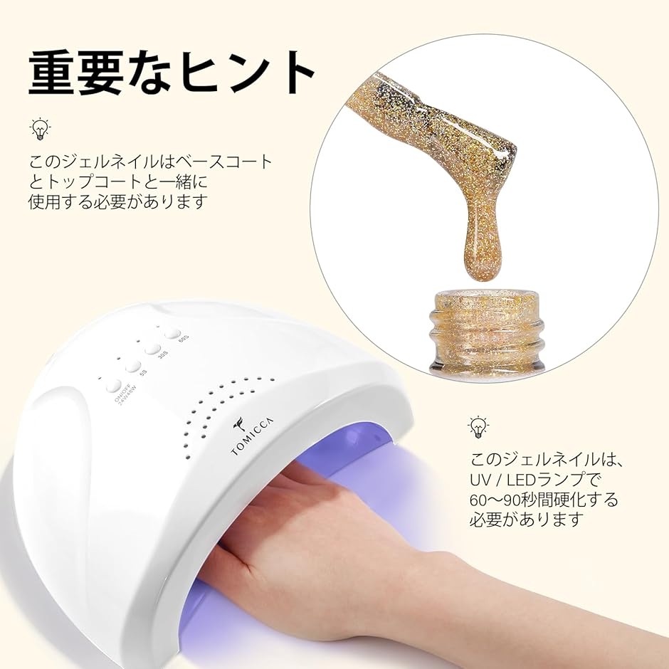 内容量: ゴールドジェル(15ml/本)、TOMICCA UV LED ジェルネイルポリッシュ、ジェルネイルポリッシュセットは、UV/LED ネイルドライヤーで硬化する必要があります。