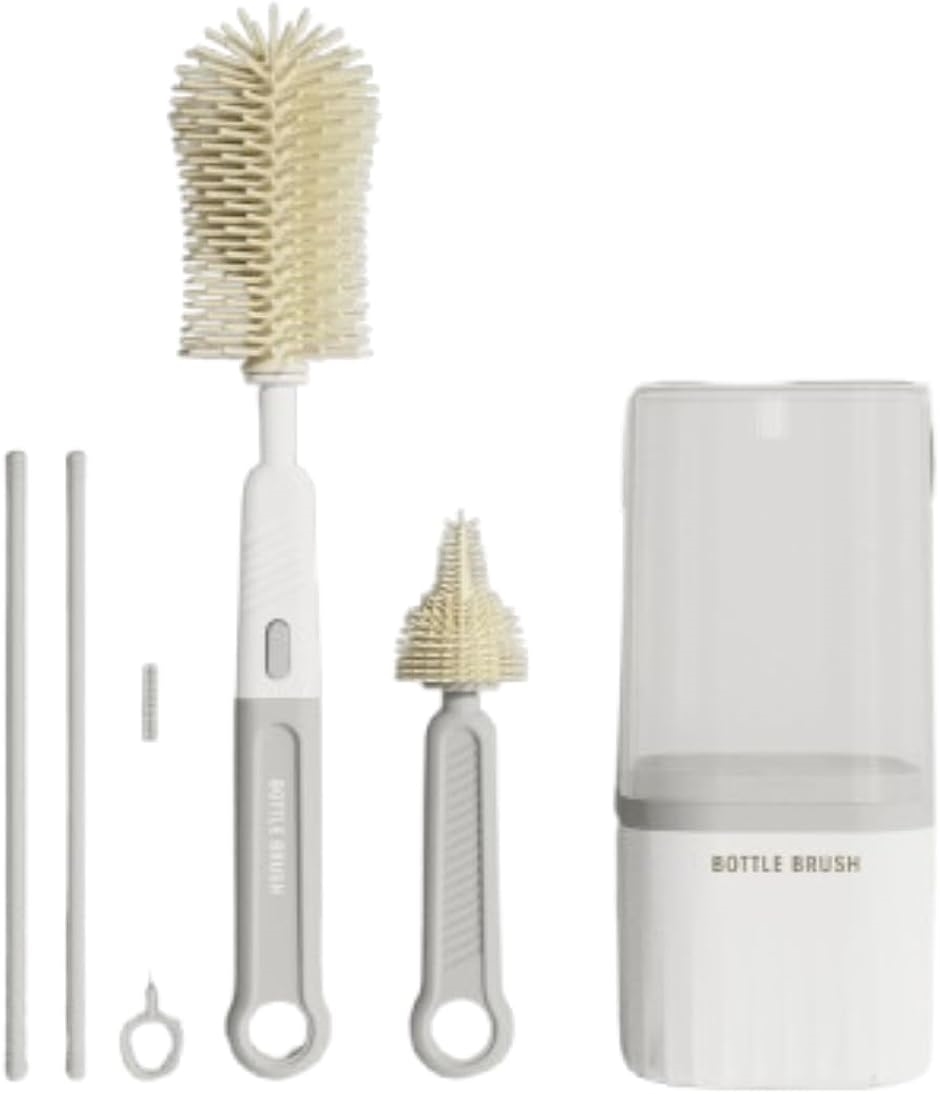 「赤ちゃんのために、毎日清潔に」哺乳瓶ブラシ、乳首ブラシ、瓶口ブラシ、ストローブラシ、乾燥棒x2、収納ケースが一式に。