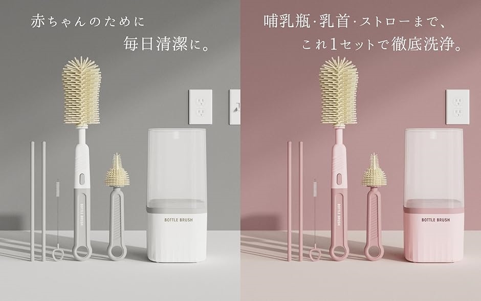 「4種ブラシで細部まで洗える」・哺乳瓶ブラシ:底まで届くロング設計・乳首ブラシ:やわらかシリコンで優しく洗浄・瓶口ブラシ:細かい汚れや溝もスッキリ・ストローブラシ:細い管の中までしっかり届く