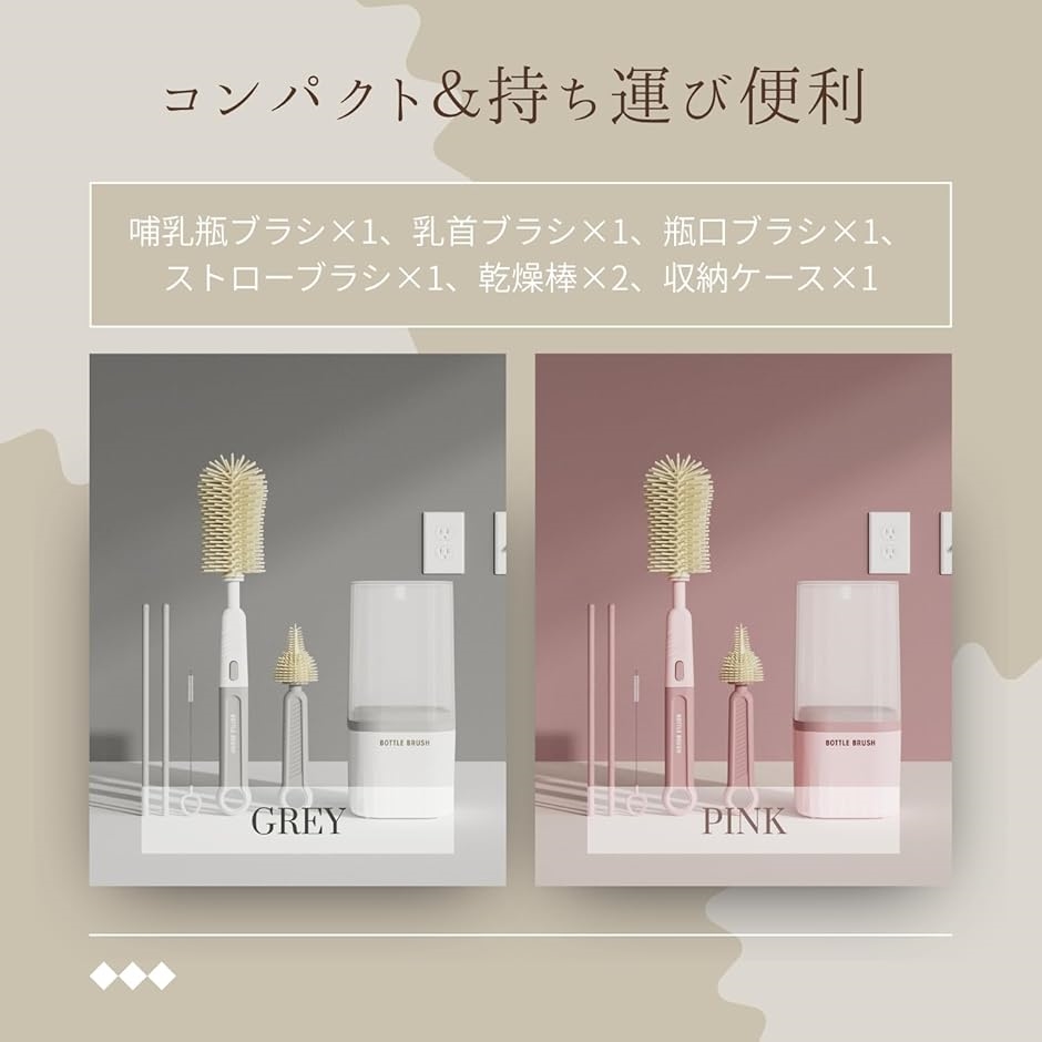 「コンパクト&持ち運び便利」・カラー:グレー/ピンク・付属品:哺乳瓶ブラシx1、乳首ブラシx1、瓶口ブラシx1、ストローブラシx1、乾燥棒x2、収納ケースx1