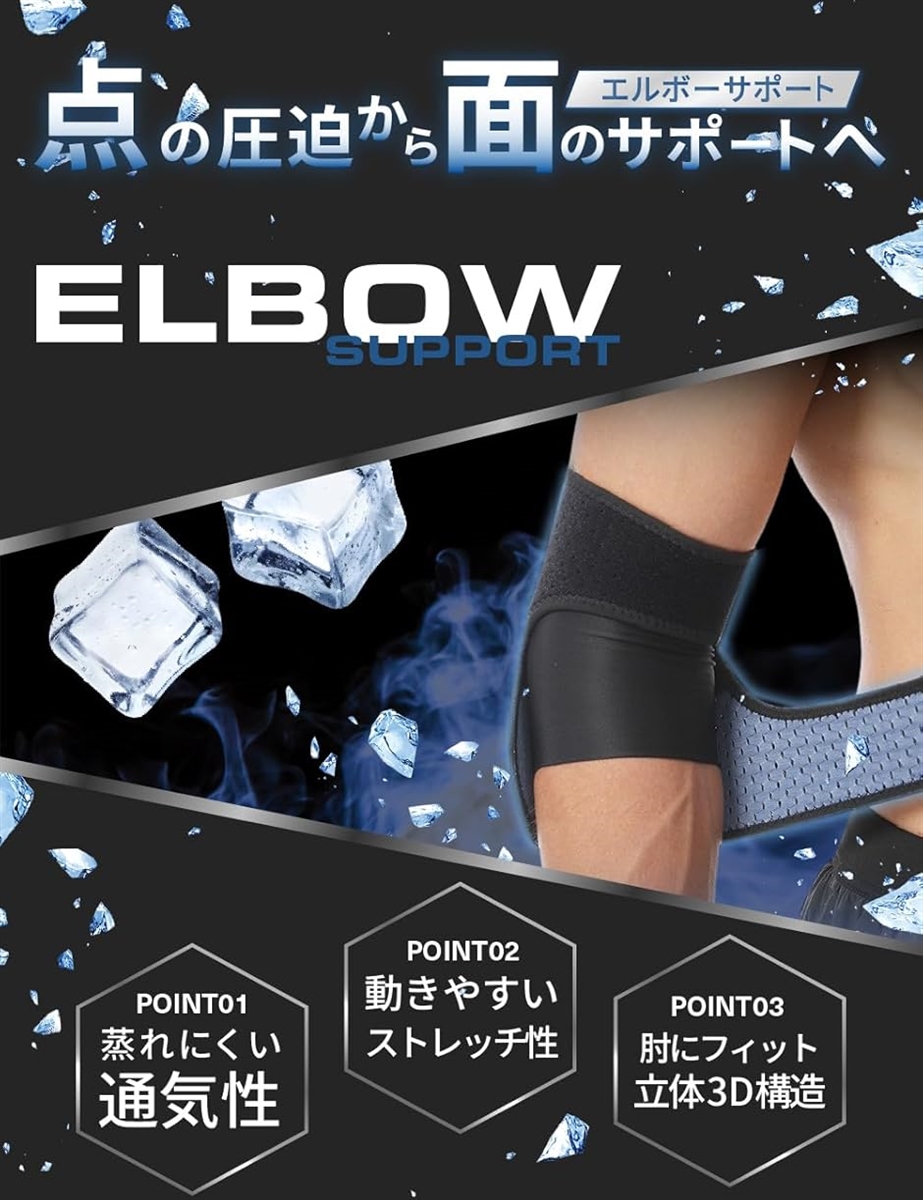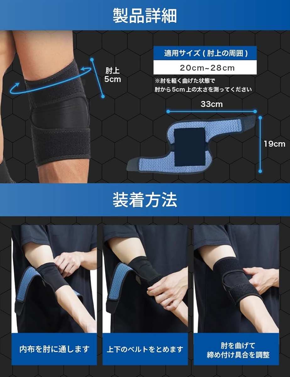 | 商品名 | 肘サポーター 点の圧迫から面のサポートへ エルボーバンド エルボーサポーター テニス肘 ゴルフ肘 野球肘 ベルト付き 男女兼用 ひじ上周囲20-28cm対応調整可能 |